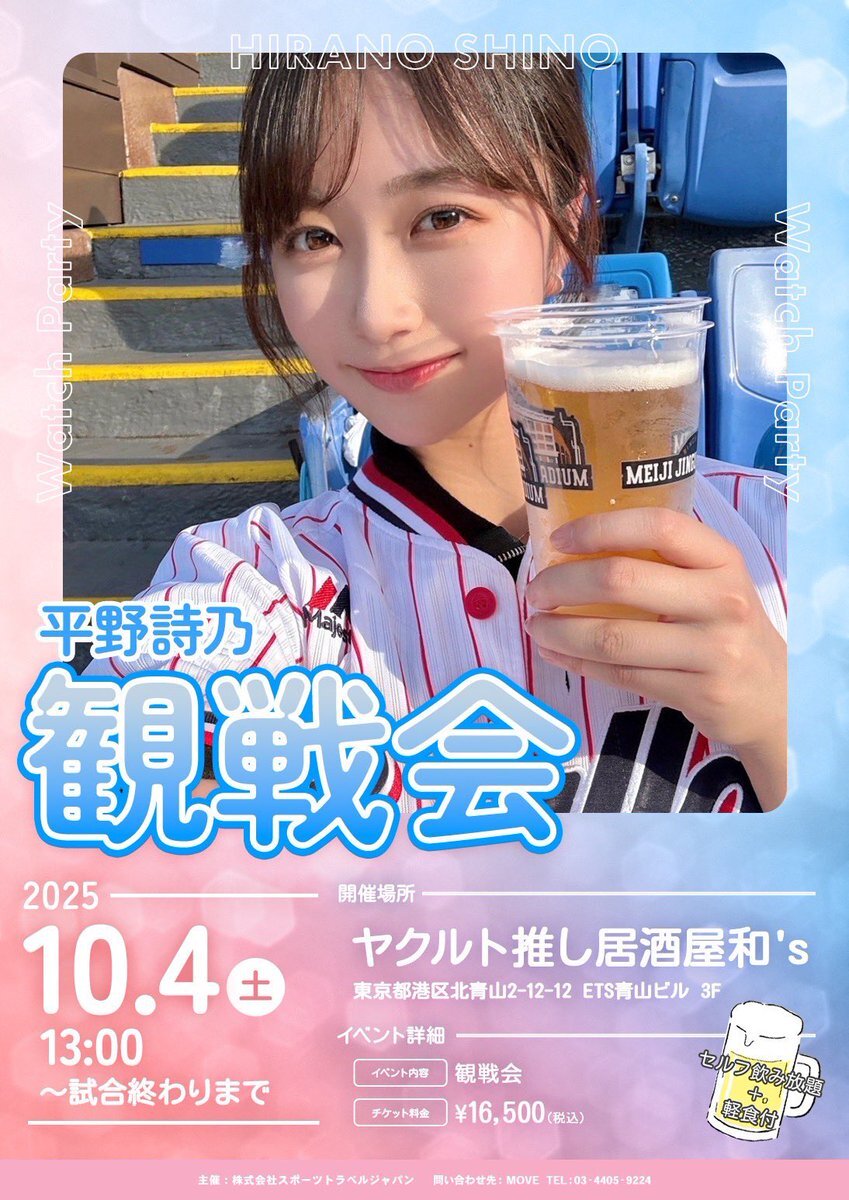 野球好きには最高のレギュラーシーズン締めくくりなのでは? ええ、YSファンのみならず、相手、更に先にレギュラーシーズン終えてるチームのファンの方も、飲みながら応援(応燕?)してシーズン振り返りましょう。 #平野詩乃 #観戦会 #応燕 x.com/hrnsn_official…