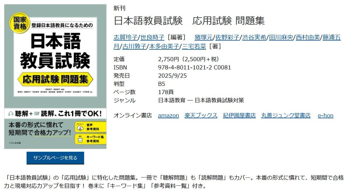 【重版出来 第3刷】 『日本語教員試験 応用試験 問題集』 志賀玲子/世良時子 編著 猪塚元ほか 著 日本語教員試験の応用試験に特化した問題集。聴解問題も読解問題もカバー。本番に近い形式で合格力アップ!「キーワード集」付。 9640.jp/book_view/?1021 試験はいよいよ今週末。