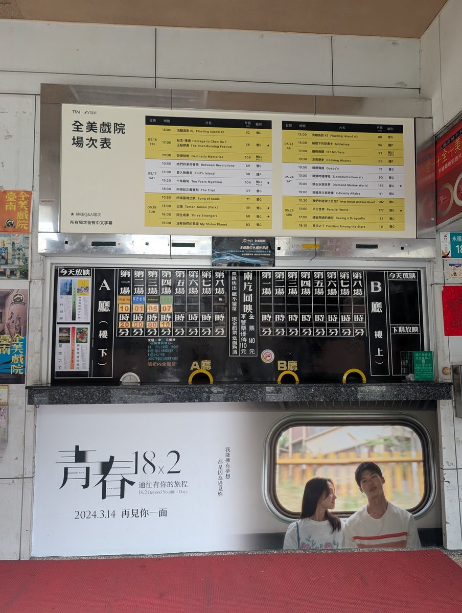 #思い出映画館 2位:台南の #全美戯院(ぜんびぎいん)。 #青春18×2君へと続く道 の上映タイミングだったのに観なかったのは痛恨(結局、映画は日本で観ました)。 行きたいタイミングで映画は観るものだと思ってから人生がちょっとおかしくなった気がします。ちなみに、2025年3月で閉館。むう。 pic.x.com/x8j8tnhPz3