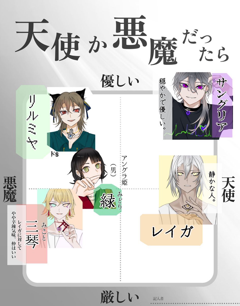 #タルパ思念体界隈テンプレ集 #思念体界隈民さんと繋がりたい テンプレお借りしました! 。直近でイラストが出来上がった 創造型たちはこんな感じです。 悪い人ではないけど、 天使ではないだろ集団が 左側の人達です。 pic.x.com/OirxjnoHFB