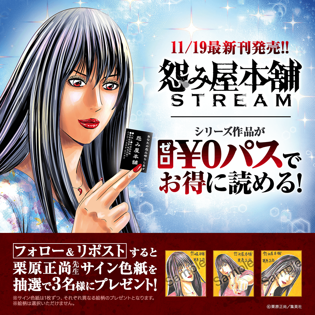 / 『#怨み屋本舗STREAM』 最新刊発売記念🎊 \ シリーズ作品が¥0パスで計60巻以上無料! 📚manga-line.onelink.me/2kNS/siz3uyyb さらに!フォロー&リポストすると 栗原正尚先生(@showshow_jp)の サイン入り色紙を抽選でプレゼント🎁✨ pic.x.com/lCkQpptL2X