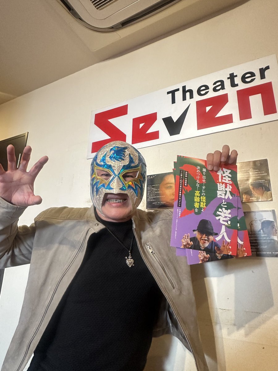#怪獣と老人 #シアターセブン 上映2日目、年齢不詳!国籍不明!博多の覆面プロレスラー〔伝説の神獣〕がわざわざ日帰りで地元博多からきてくれました!15時50分からなのにフライングペンギン!同じ年の親友!素顔で鑑賞するとこっそりメキシコごで 教えてくれたのでぜひ答え合わせにきてください! pic.x.com/F5xdG0WLRH