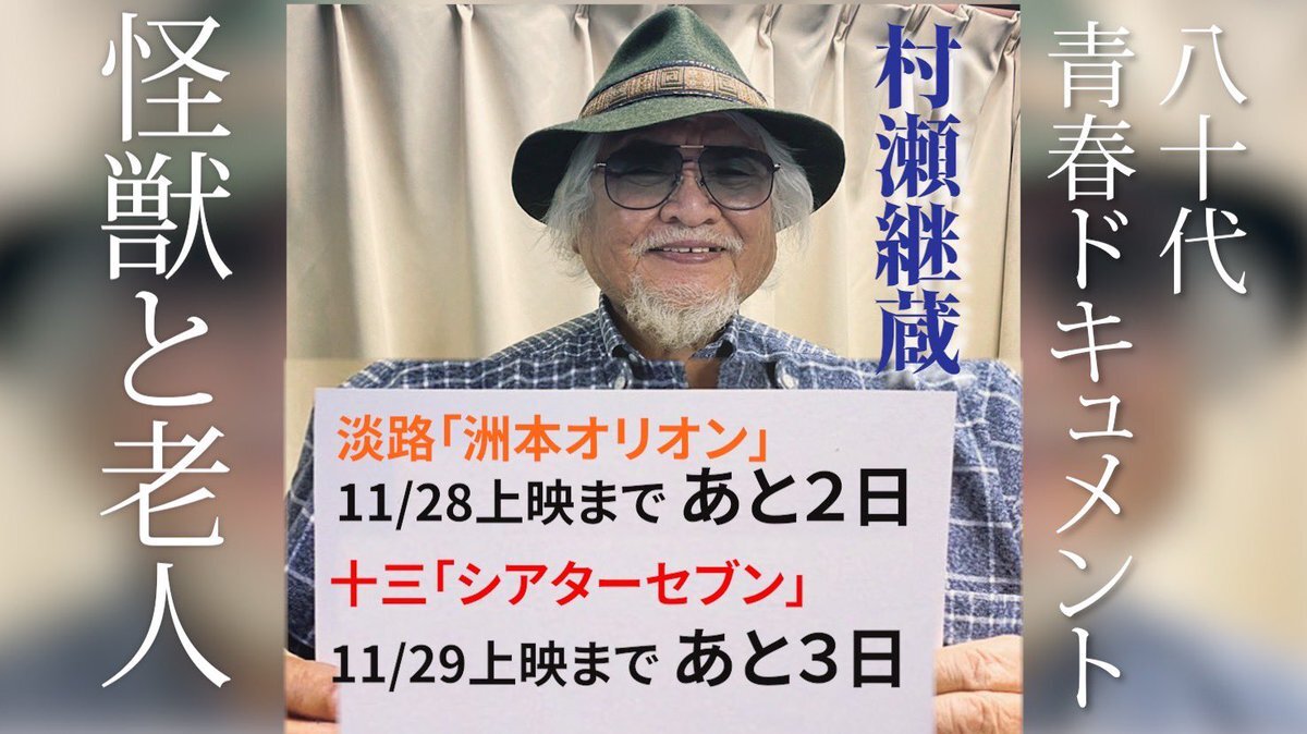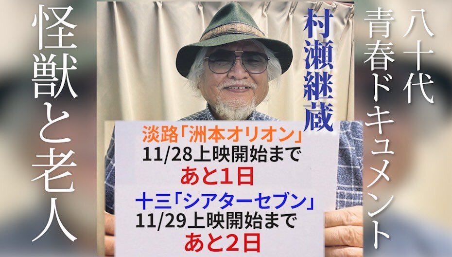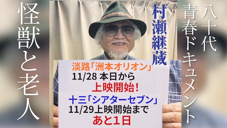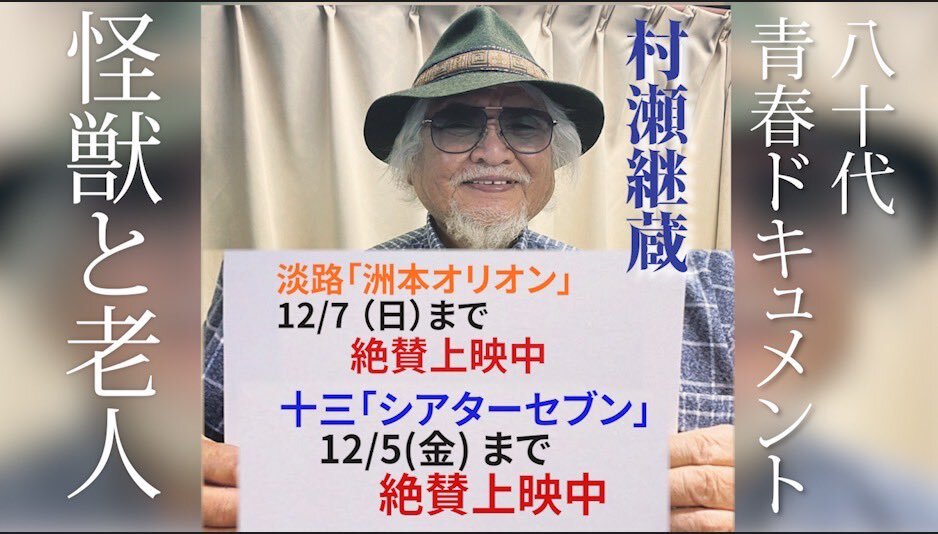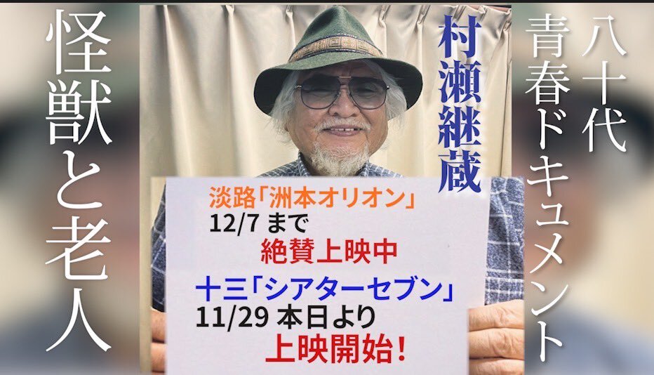 返信先:@suetakatomu#錦笑亭満堂 師匠も大絶賛(大便乗!) 事を始めるのに 80代でも小学生でも年齢は関係ない(by佐野史郎) 男・村瀬継蔵の生き様が見られるのは5日までです! ぜひ関西周辺の皆様 #シアターセブン にて 青春ドキュメンタリー #怪獣と老人 よろしくです 席は選び放題です! theater-seven.com/mv/mv_s0973.ht…