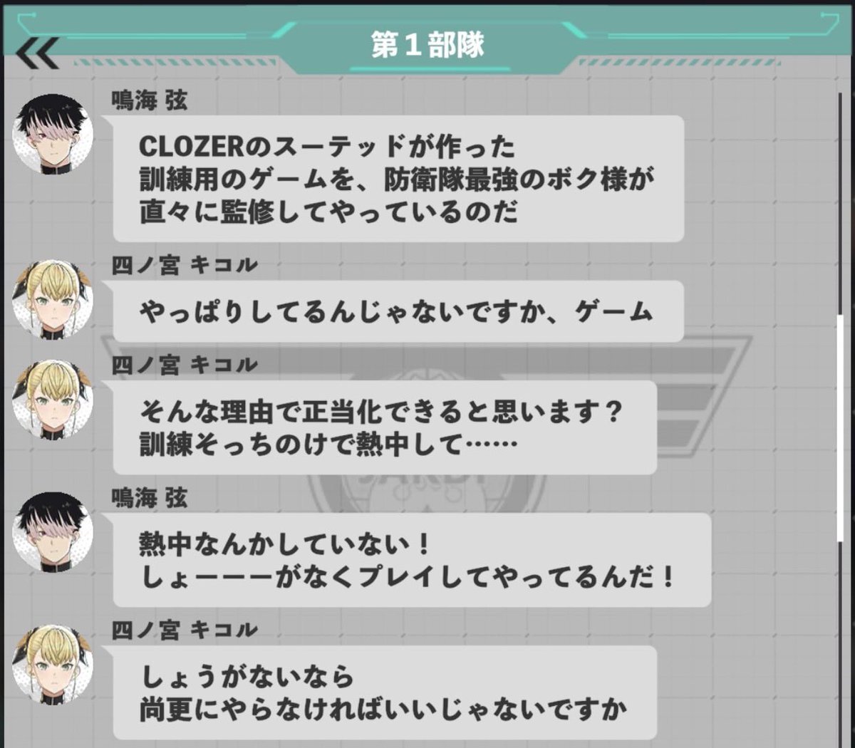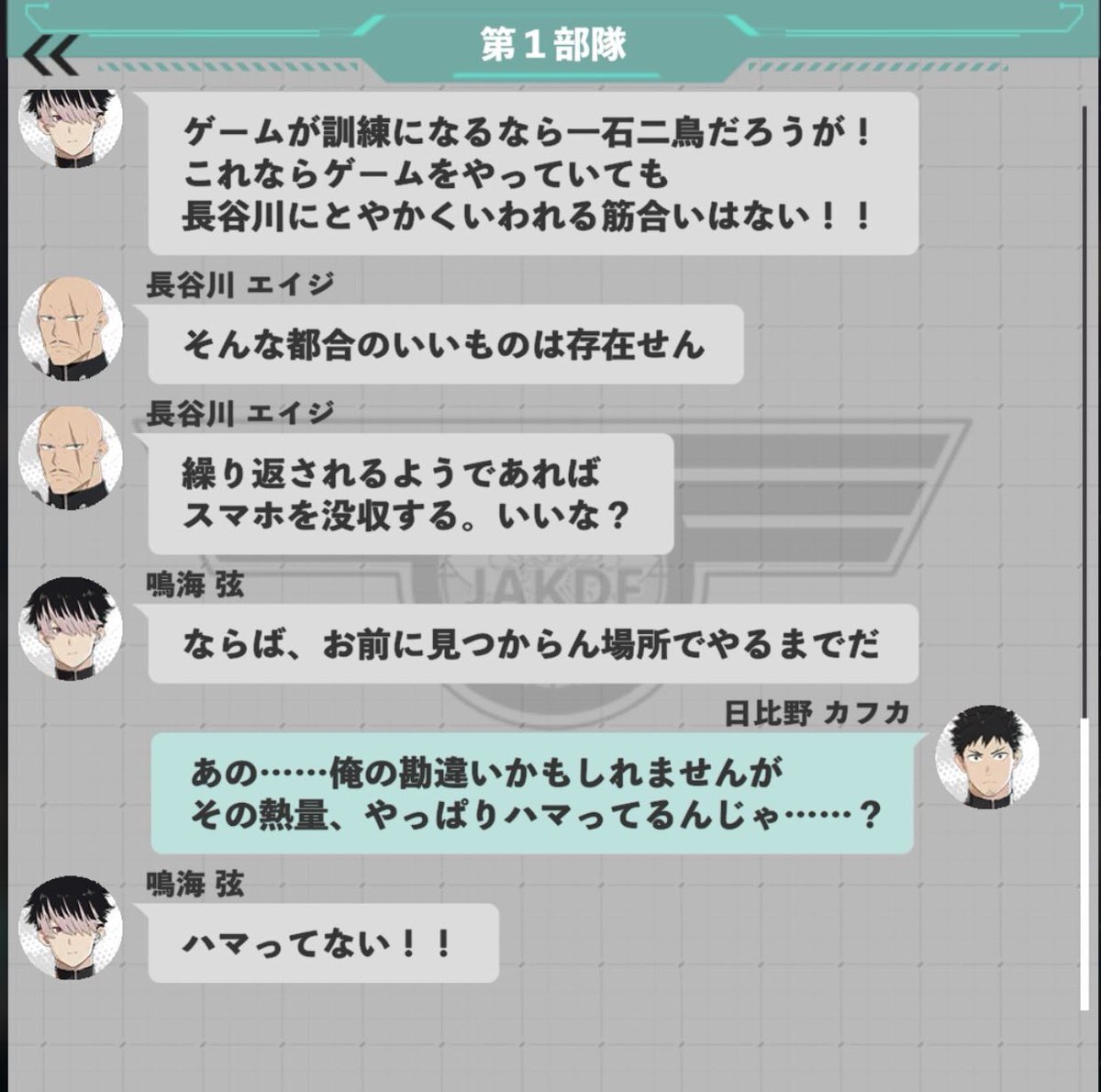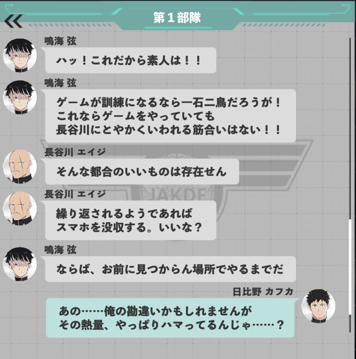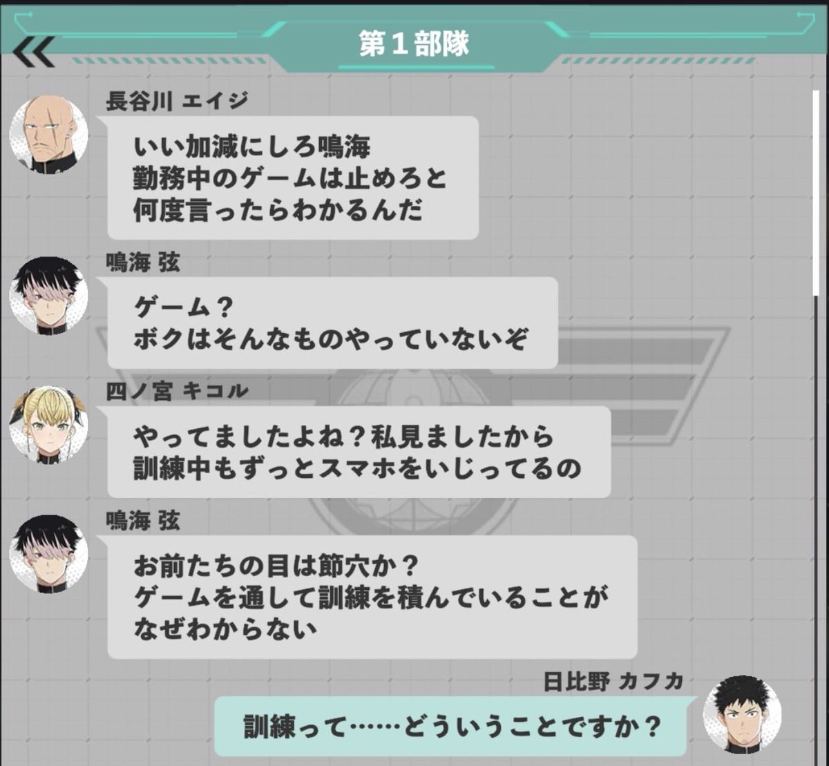 第1部隊チャット部屋の会話がアホで好き #長谷川エイジ #鳴海弦 #四ノ宮キコル #日比野カフカ #怪獣8号THEGAME #怪獣8号好きな人と繋がりたい #怪獣8G #怪獣8号 #KaijuNo8 pic.x.com/BQtYPK1Ved