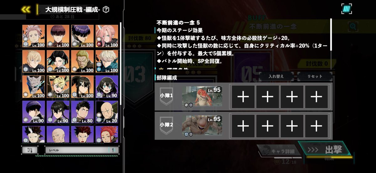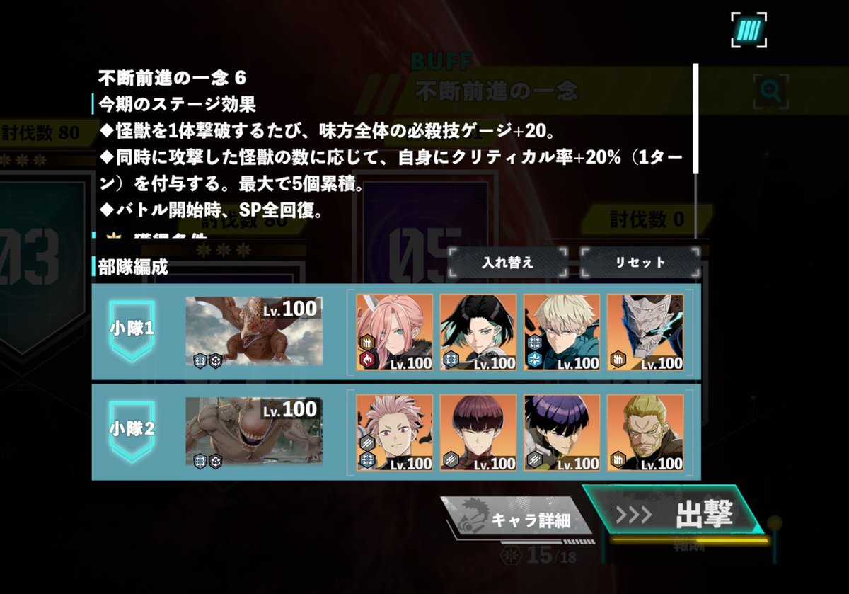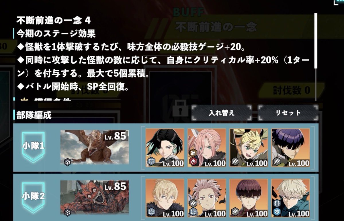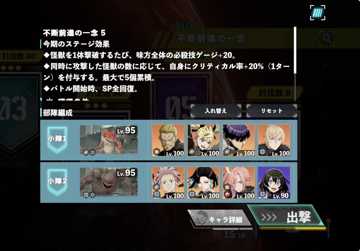 #大規模制圧戦 はbattle1(第1部隊)が5体ずつの雑魚敵だらけの物量作戦。battle2(第2部隊)が3体ずつの真ん中一体は中ボス。 なので第1部隊は全体攻撃優先で、第2部隊は複数攻撃キャラ3体にバフキャラ1人が適切。 (打撃キコルが居たらそれが最適)(持ってない) #制圧戦攻略メモ #怪獣8号THEGAME #怪獣8G