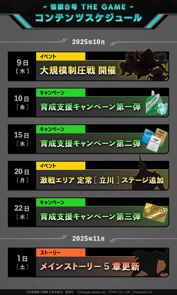 ◤ #怪獣8号 THE GAME コンテンツスケジュール ◢ 10月〜11月初旬にかけて、キャラクター強化に役立つキャンペーンや、新章更新など 様々なコンテンツを配信予定です。 開催まで今しばらくお待ち下さい! #怪獣8G