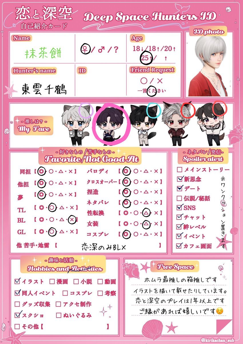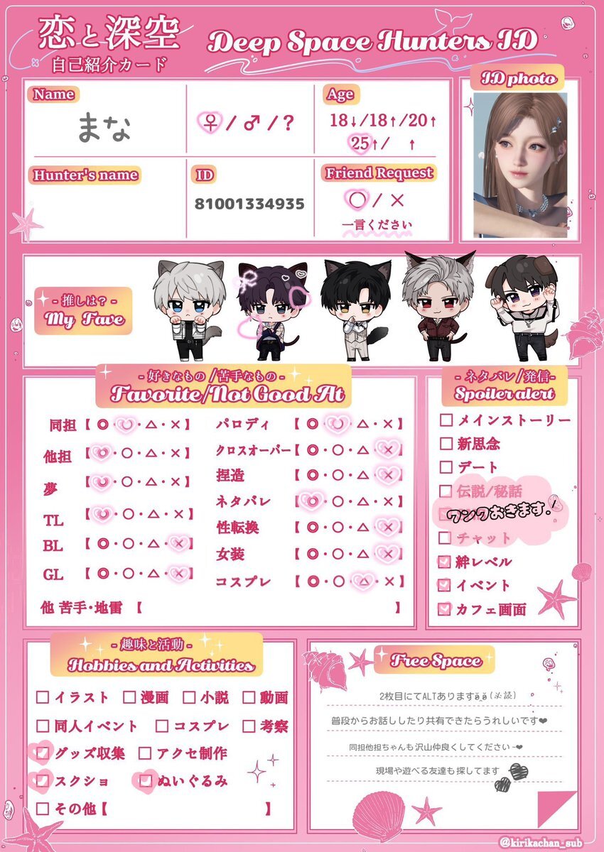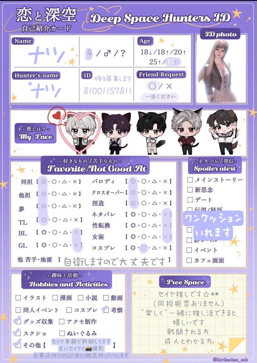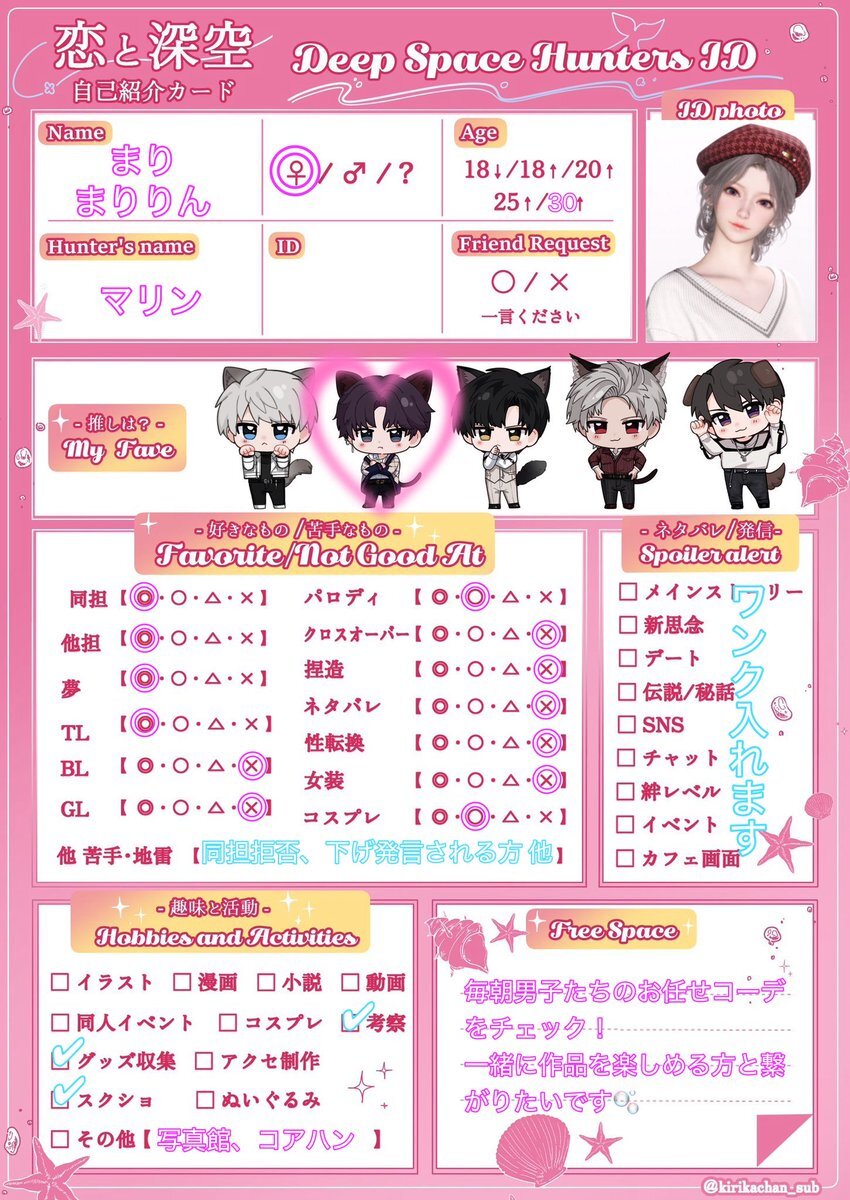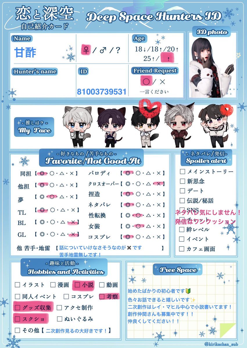 シャドバン食らってたので再掲失礼します 引用先に反応頂けたら嬉しいです(ᴖ ̫ᴖ )🎶 #恋と深空自己紹介カード #深空ハンター自己紹介 #恋と深空好きさんと繋がりたい x.com/mgmg_kanisan/s…