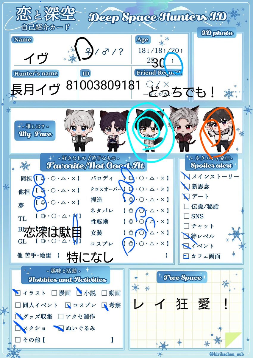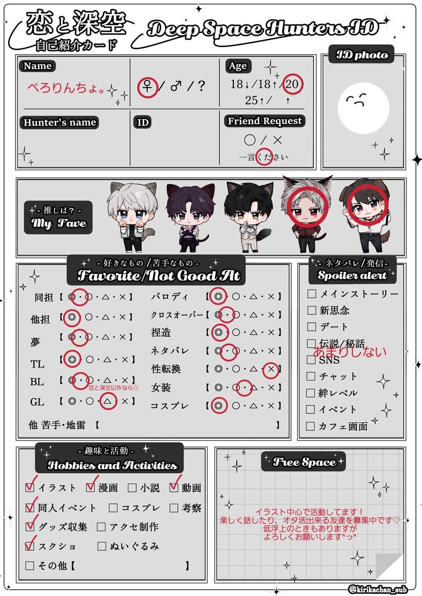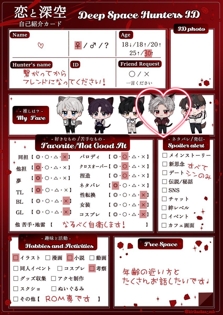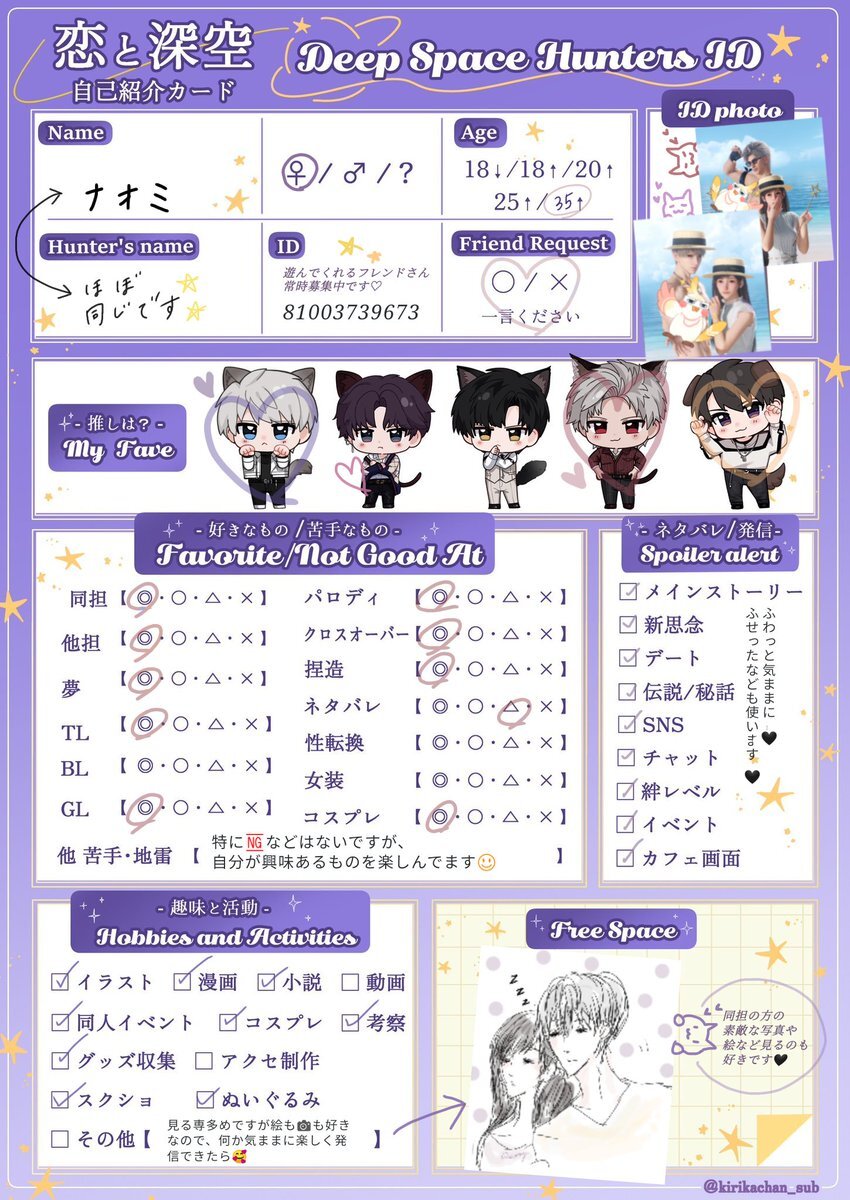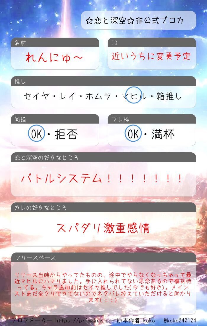 シャドバン食らってたので再掲失礼します 引用先に反応頂けたら嬉しいです(ᴖ ̫ᴖ )🎶 #恋と深空自己紹介カード #深空ハンター自己紹介 #恋と深空好きさんと繋がりたい x.com/mgmg_kanisan/s…