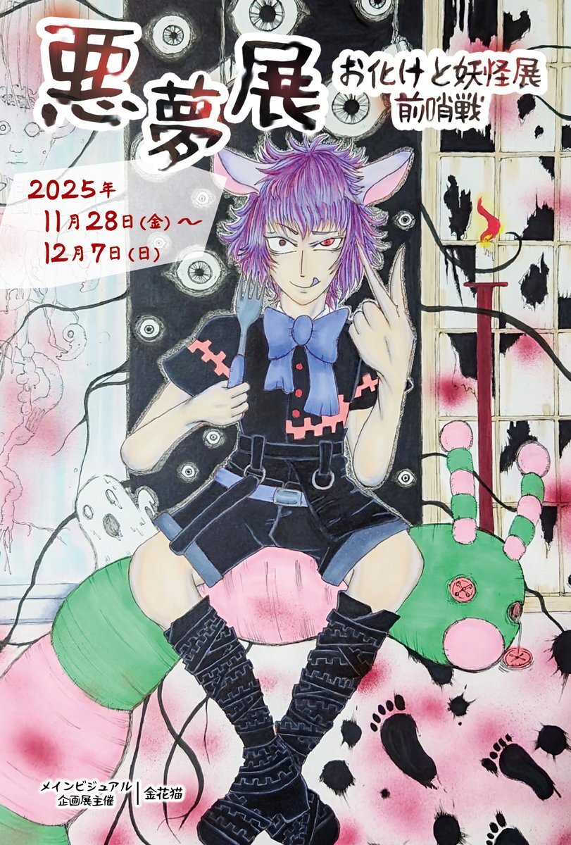 『悪夢展-お化けと妖怪展前哨戦-』#悪夢展AS 悪夢は人に話すと同じ悪夢は見なくなると言う おまじないがあります 年を越す前にあなたの悪夢を作品にして 話すを見せるカタチにして スッキリして新年を迎えませんか? 金花猫さん初主催 @xJSvJlRGxvhf7dk 11/28開催、出展者さん募集します。