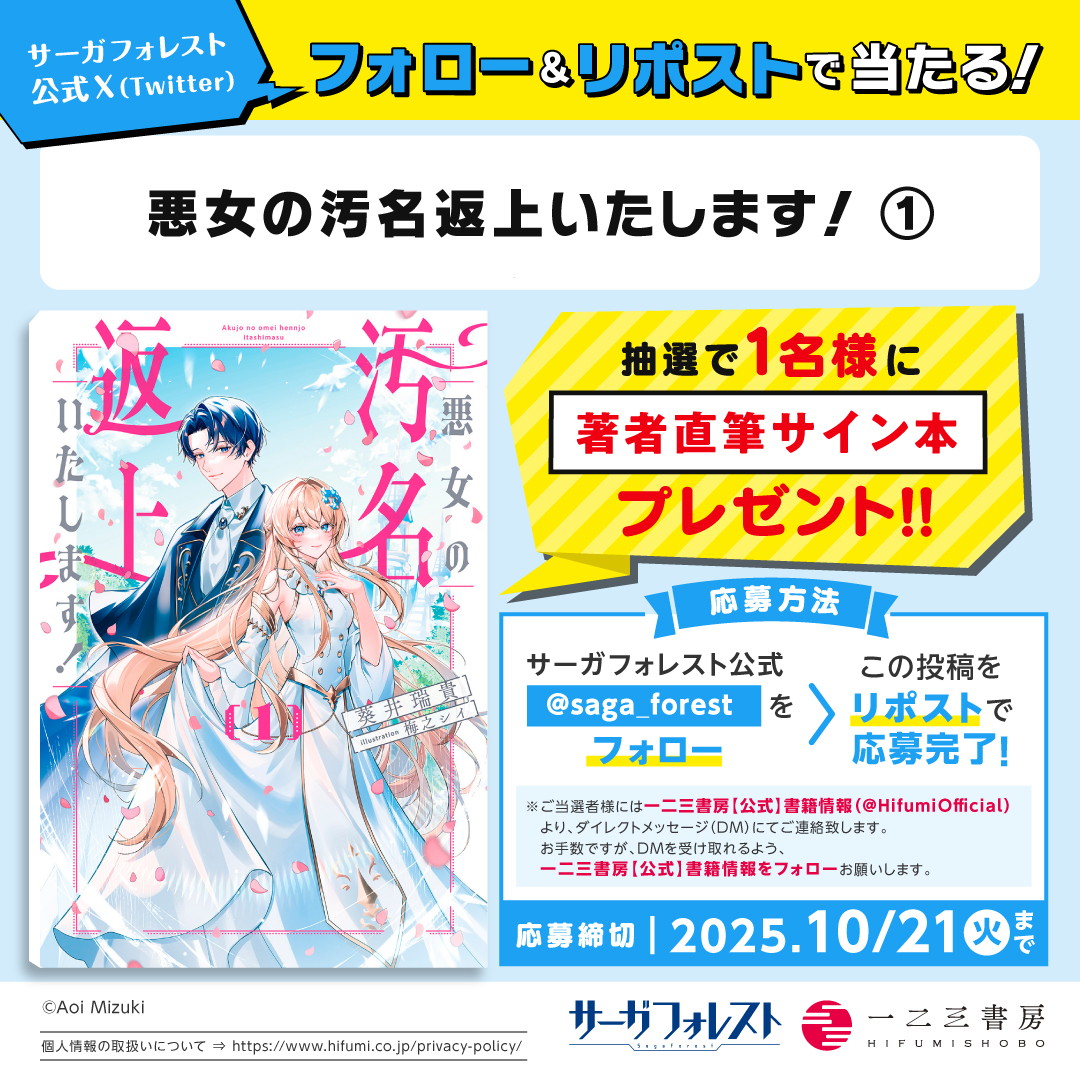 // #サーガフォレスト 10/15発売の新刊が フォロー&リポストで当たる!! \\ 『#悪女の汚名返上いたします!1』 葵井瑞貴 先生の直筆サイン本を 1名様に #プレゼント! ①@saga_forest をフォロー ②この投稿をリポストで応募完了 〆切:10/21(火)23:59✨