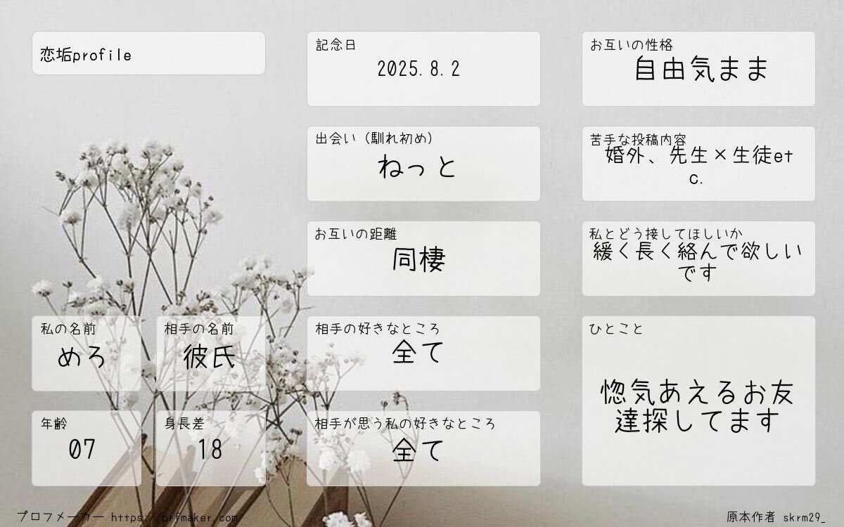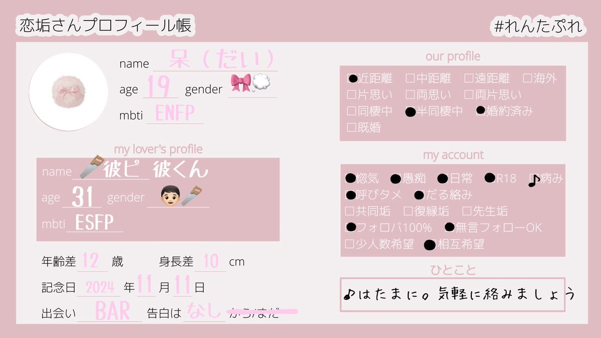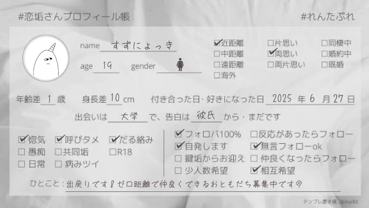 半年ほど前に別れたのですがまた好きになってしまったので恋垢始めました‼ 惚気合えるお友達たくさん募集してます🍀ぜひ仲良くしてください>< 全反応お迎えさせていただきます🎶 詳細ALT #恋垢 #惚気垢 #恋垢さんと繋がりたい #惚気垢さんと繋がりたい #れんたぷれ pic.x.com/yx1Aeez6L5