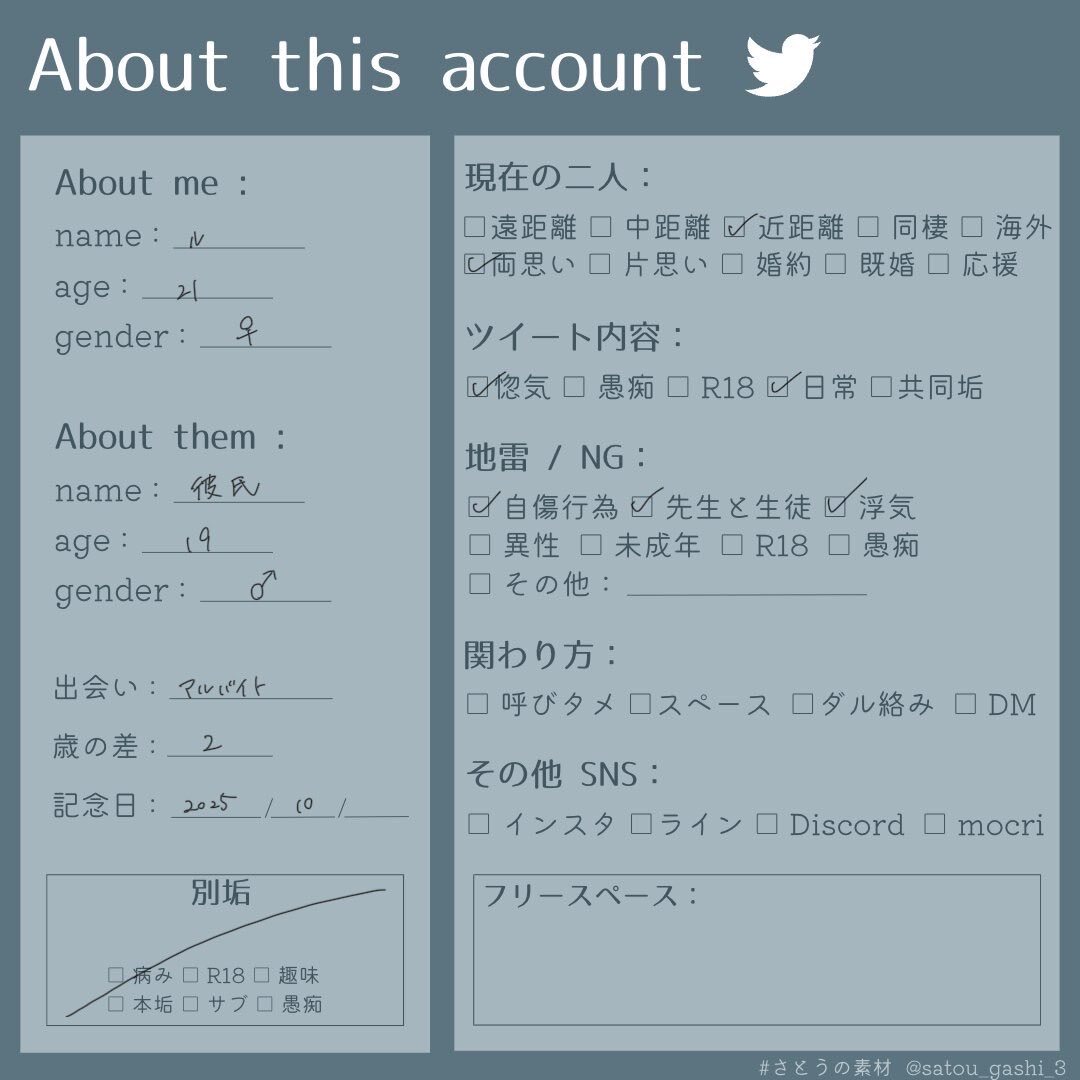 対よろ。 良ければ読んで。 気になったら声かけて 悪質じゃない人と繋がりたい。 #闘病垢さんと仲良くなりたい #恋垢プロフィール #惚気垢 #雑多垢 #お友達探し #いいねでお迎え (するかもしれない) #時間差OK pic.x.com/Qb7dD5fqqF