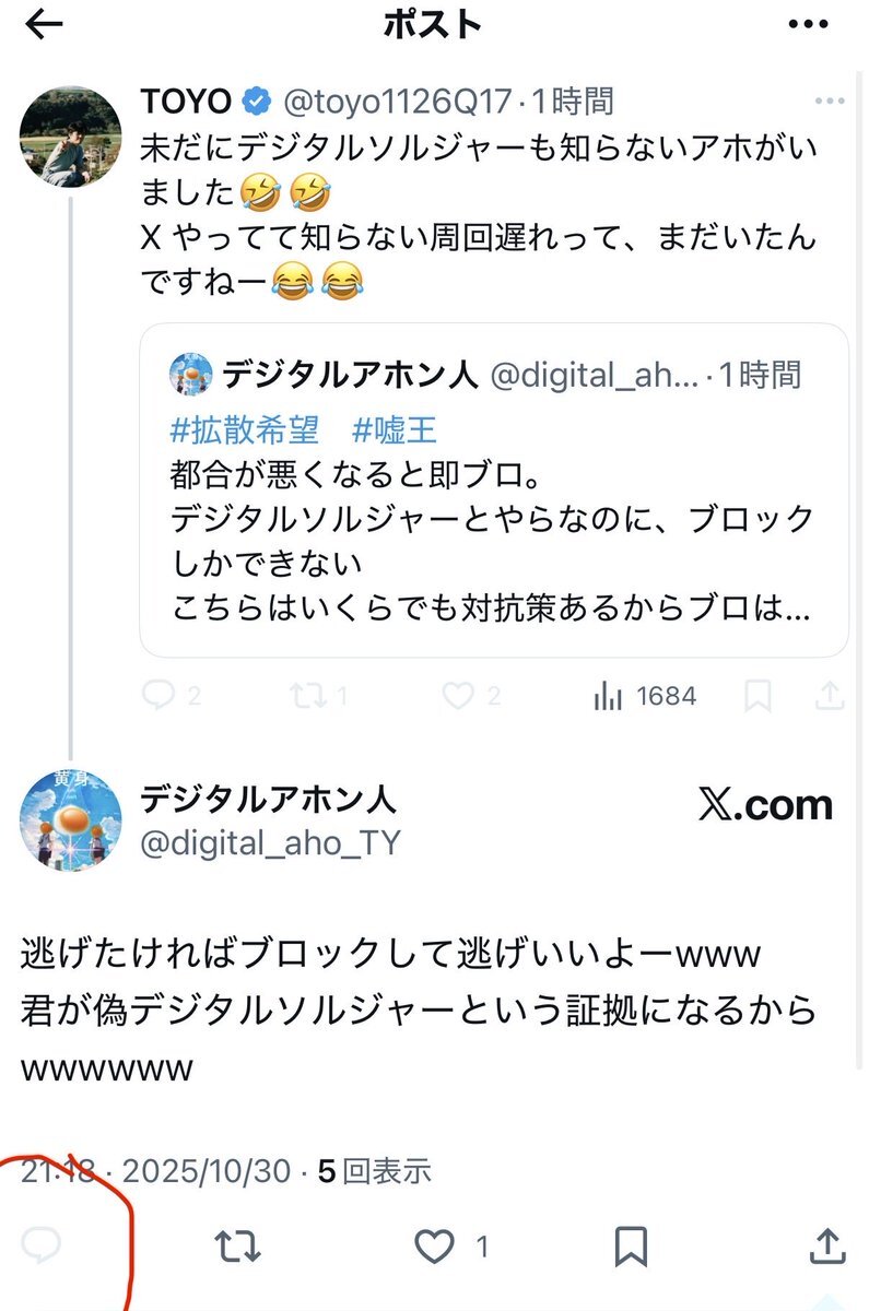 返信先:@toyo1126Q17#拡散希望 #惨敗 #インチキソルジャー #敵前逃亡 はい、負け認めたねwwwwww 何もできず結局ブロックwwwwww 口だけという事を自ら認めましたw 無視してもいいのにブロックだもんね❤︎ pic.x.com/oMqnbvpzho