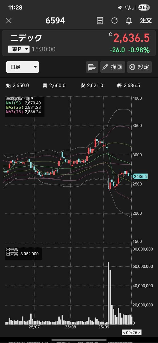 【6592】ニデック 監査報告書の「意見不表明」で注目されたニデック。 寄り付きは強い売りに押されましたが、即座に買い戻しが入り下落を帳消しに。 ただ、先行き不透明な銘柄には、個人的には手を出したくありません。 #ニデック #意見不表明 #監査報告