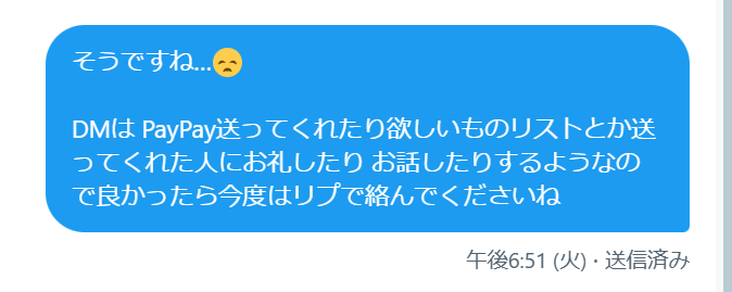 基本DMは仲のいい人と交流するためのものだと思ってて、PayPayとかの件で送ってくれる人がDM下さるのはありがたいんだけど、普通のトークだったらリプから絡んで欲しくて、今までにもポストでPayPayの件以外でのいきなりのDMは返しませんとか #愚痴 #愚痴垢 pic.x.com/PVBnXuGTVi