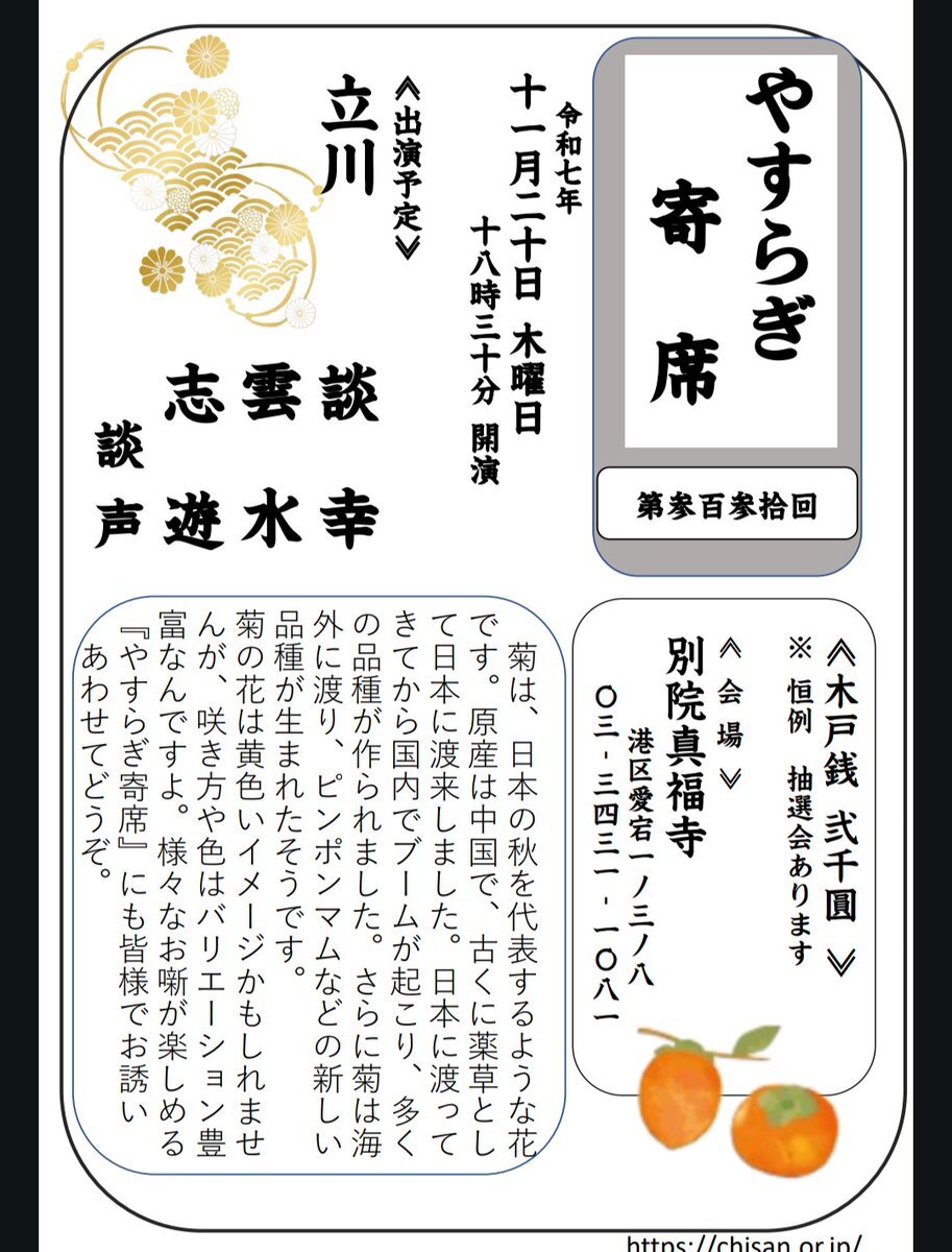 #落語 #愛宕 やすらぎ寄席 2025年11月20日(木)18:30開演 愛宕 別院真福寺2F ご本堂 2000円 今回は終演後の抽選会にて、昨年旅立たれた立川ぜん馬師匠より景品のご提供がございます!宜しければ何卒のご来場を!🙇♂️ pic.x.com/U3gmV3RLYt