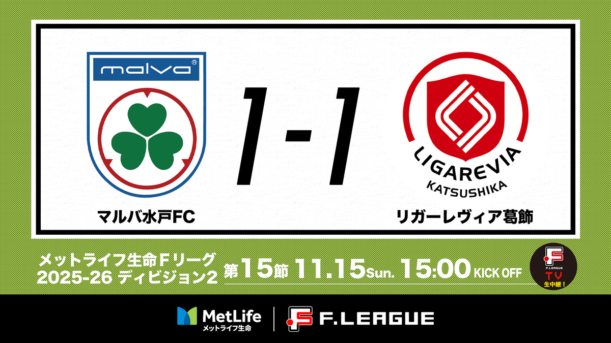 ✅試合終了🔥 🏆#メットライフ生命Fリーグ 2025-26 ディビジョン2 📍第15節 📅11.15 15:00 🆚水戸 1-1 葛飾 🏟まるたか観光アリーナ 📺fleague.stores.play.jp/lives/b6443e0b… 【男女全試合配信→毎節1試合無料✨】 Fリーグ・女子Fリーグ観るなら #FリーグTV #フットサル #ついてこれるか #感動が加速する pic.x.com/aoqjm0NudJ