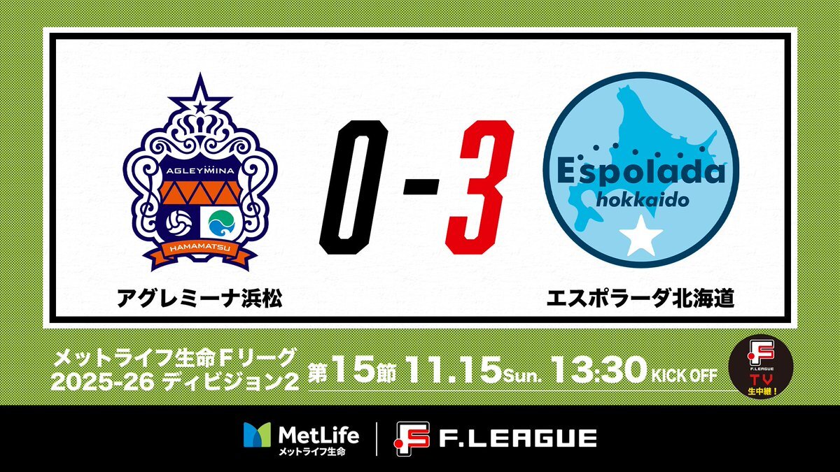 【試合結果📝】 Fリーグdiv2 第15節 vs #エスポラーダ北海道 前半 0-1 後半 0-2 合計 0-3 相手の守りを崩せずホームで悔しい敗戦となりました。 応援ありがとございました。 #アグレミーナ #アグレミーナ浜松 #メットライフ生命fリーグ #感動が加速する #ついてこれるか #hamamatsusports pic.x.com/XztNNCCYFs