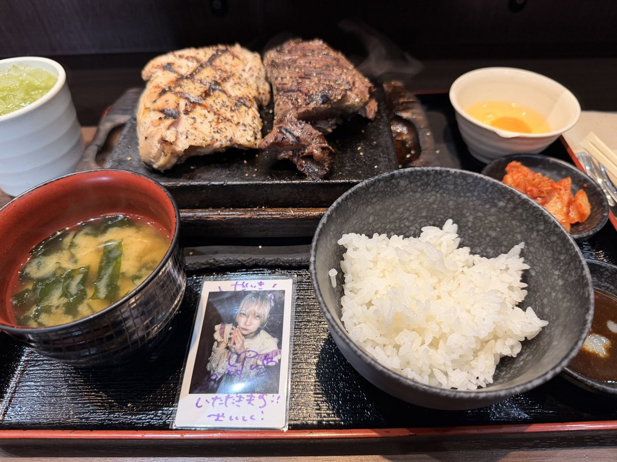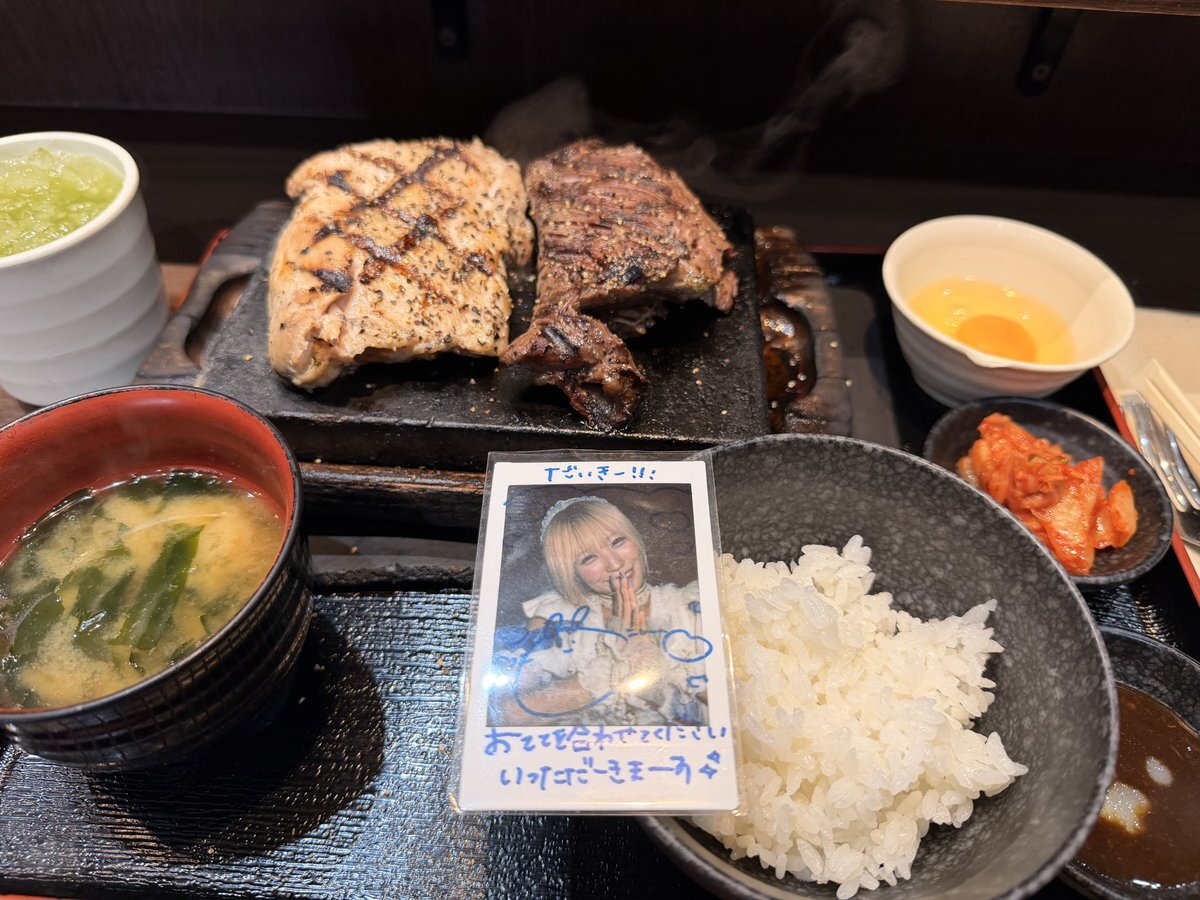スタバなう💜 うるちゃん今日はうるちゃんも好きな お肉(🥩ステーキ)だよ💜 ハラミステーキとチキンステーキのダブルメインだよ💜 ハニバニ💜望月うるちゃん(の写メ・チェキ)と一緒にいただきました💜 ご馳走様でした💜 #ステーキ #感動の肉と米 #あみやき亭系列 #いただきます #推し活 pic.x.com/MhdQty9ujh