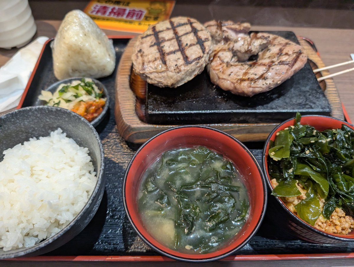 今日はトラブル続きでやっとメシ 遅くなった分「よし!ガッツリ食うぞ!」とハンバーグにワイルドハラミをトッピングしたっけ、なんと14時以降のサービス品のガーリックおにぎりまで無料でなんと1450円 今日の夕飯要らないかな🤣 #感動の肉と米 調べたら #あみやき亭 のグループとの事 ゴチでした