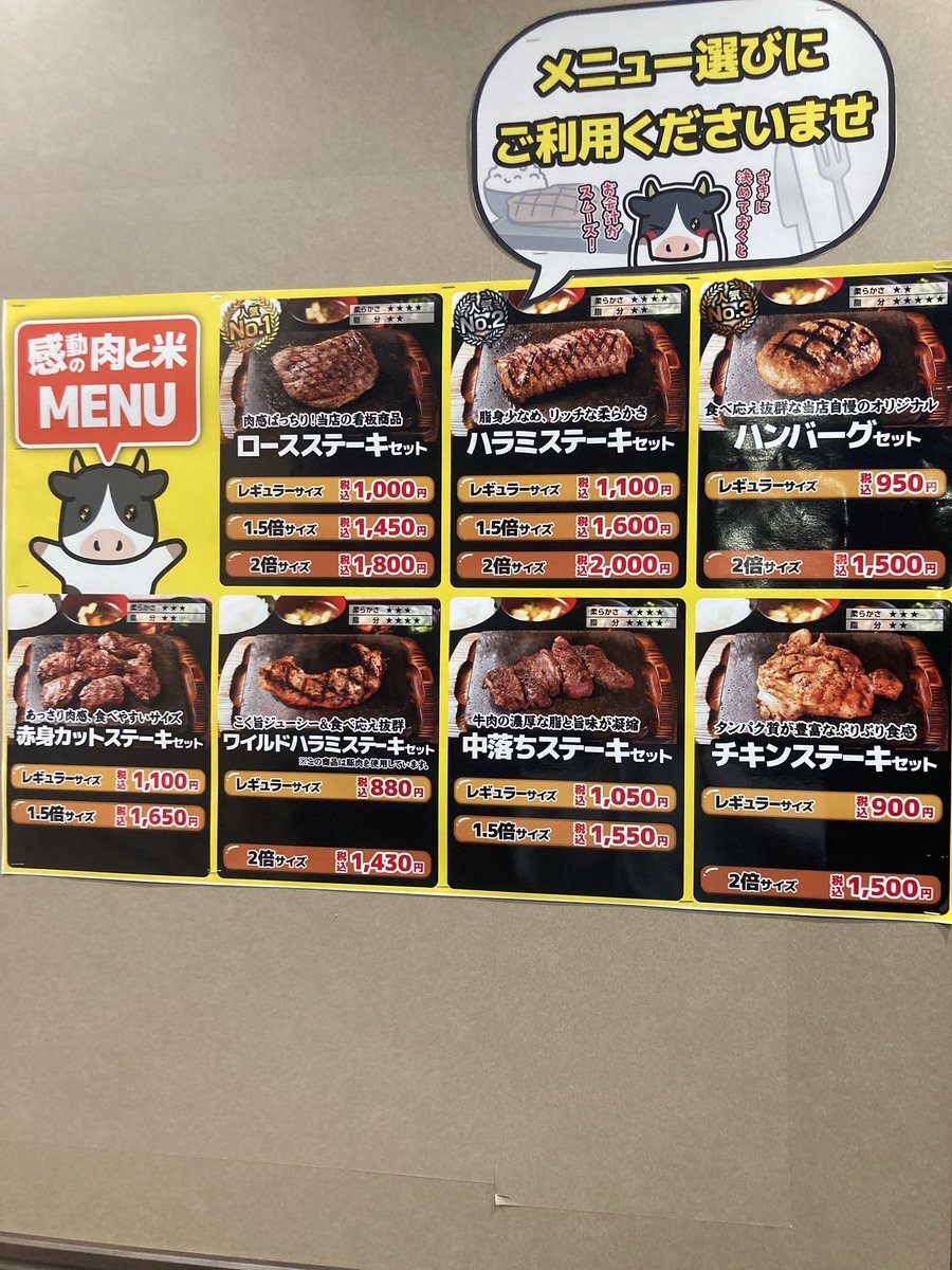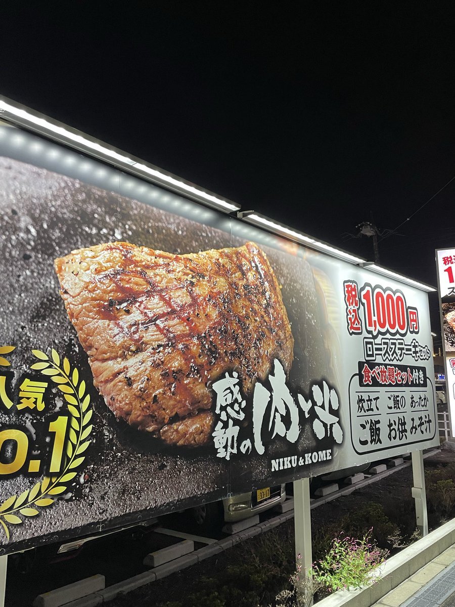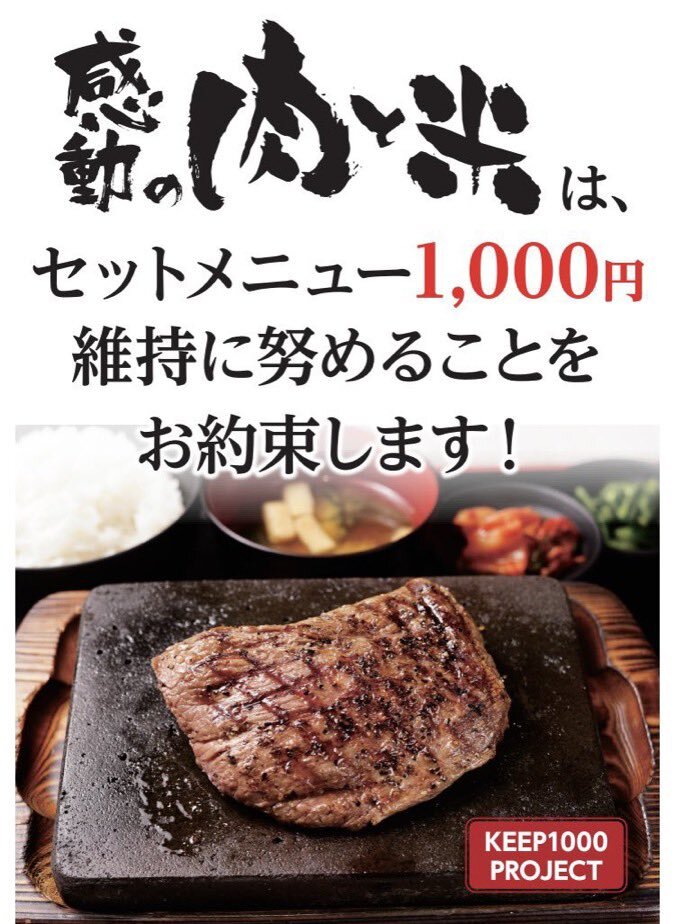 感動の肉と米で、以前に掲げられていた1000円維持宣言 いろんなメニューが値上げになる中、ロースステーキセットだけは価格維持してるっていうのは本当にスゴイと思う☺️ 他のメニューは値上げしたとはいえ全然安いからねー😊 控えめに言って、そんな感動の肉と米が大好きです😆 #感動の肉と米 pic.x.com/RLbZyvPavY