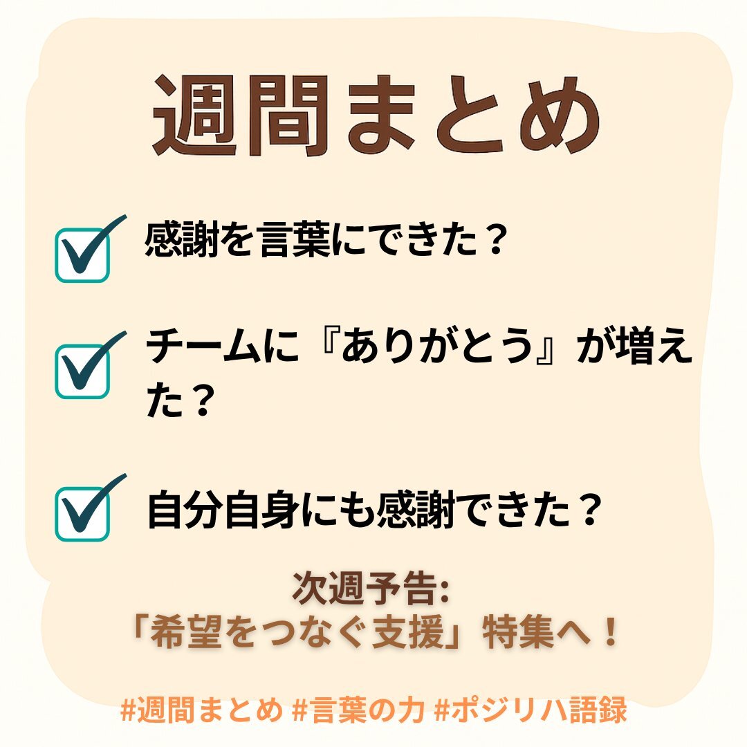 21 感謝を伝える支援 今週もおつかれさまでした! 感謝の連鎖がチームの原動力。 来週は「希望をつなぐ支援」を特集します✨ #週間まとめ #感謝を伝える #ポジリハ語録 pic.x.com/6mHrJdvoVZ