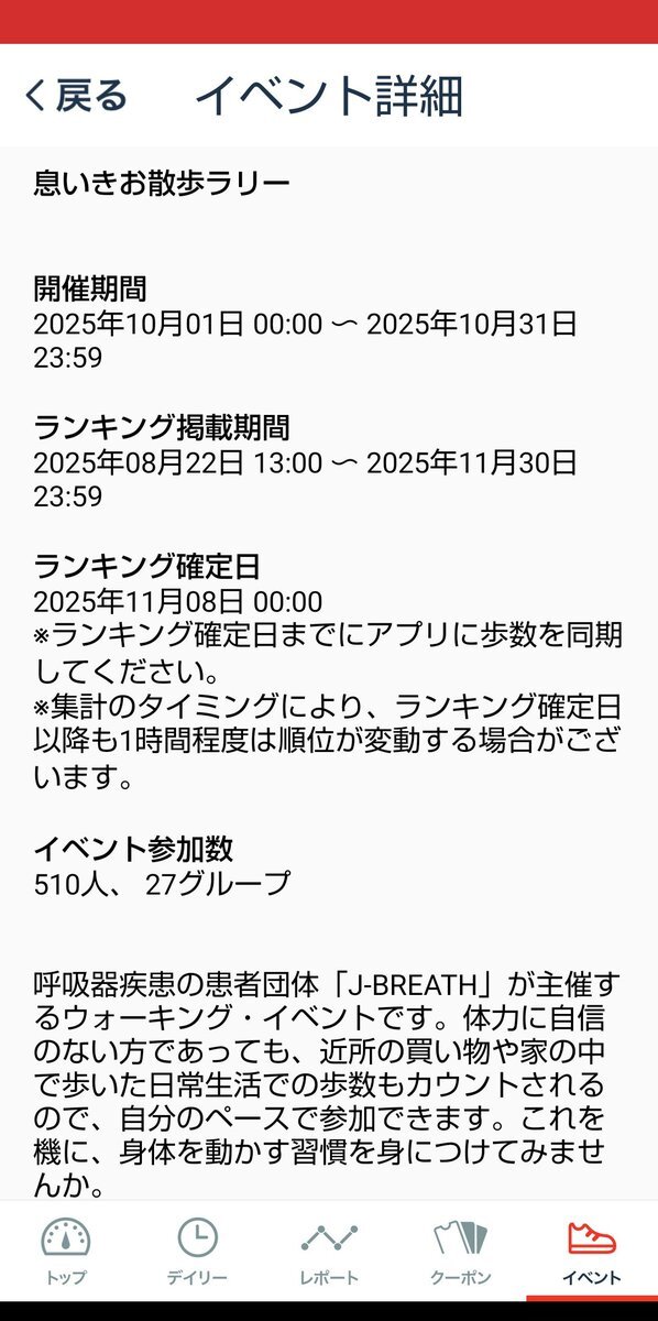 【J-BREATH会員 息いきお散歩ラリー歩数表の返信のお願い】 9月に歩数表を送付しています。歩数の入っていない日があっても構いません。 参加賞:ラングウォークTシャツ 皆さまの歩数表と感想をお待ちしております。 #慢性呼吸器疾患 #COPD #間質性肺疾患 #肺NTM #肺MAC #気管支拡張症 #肺結核後遺症