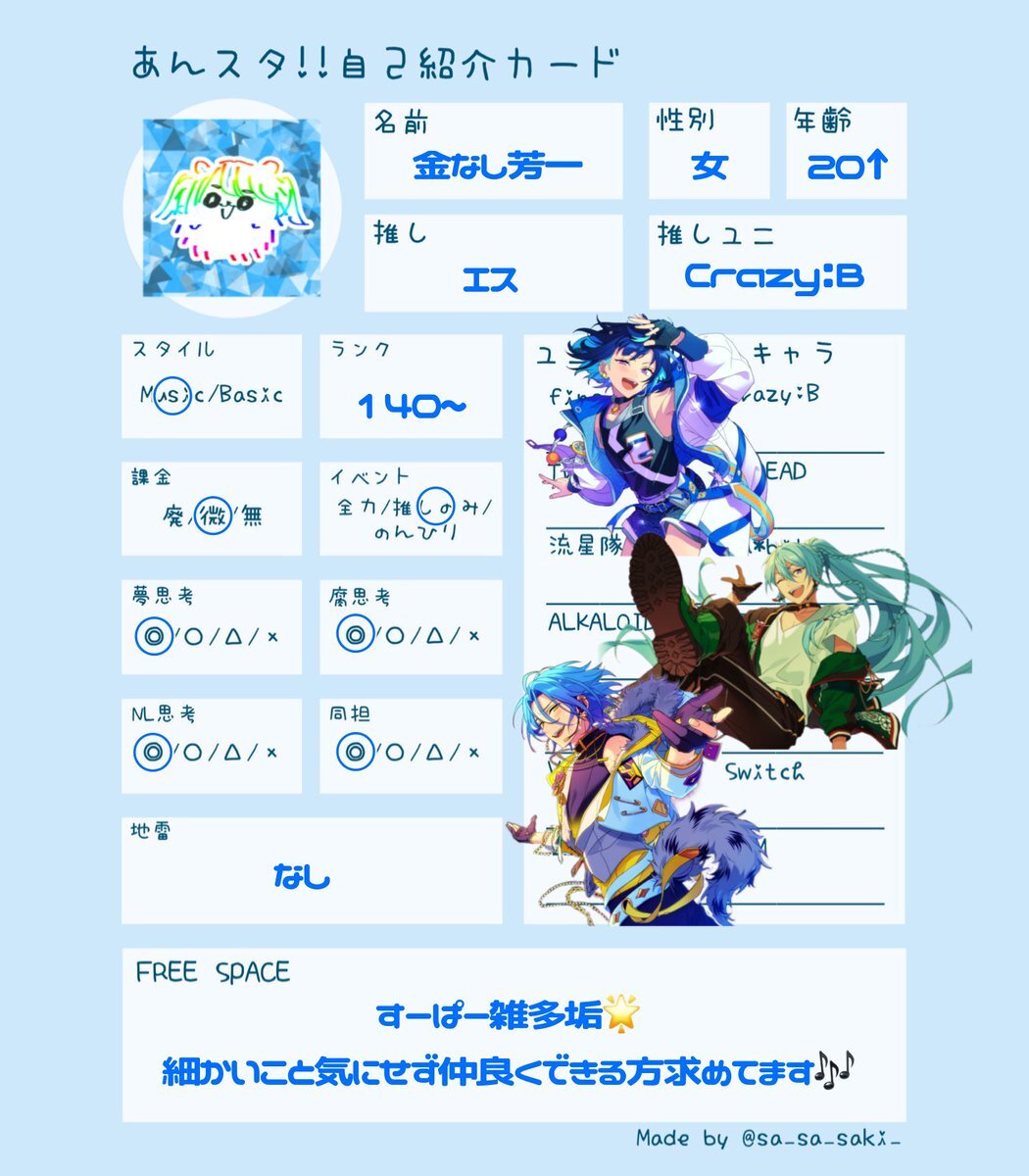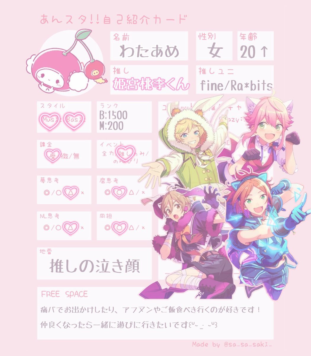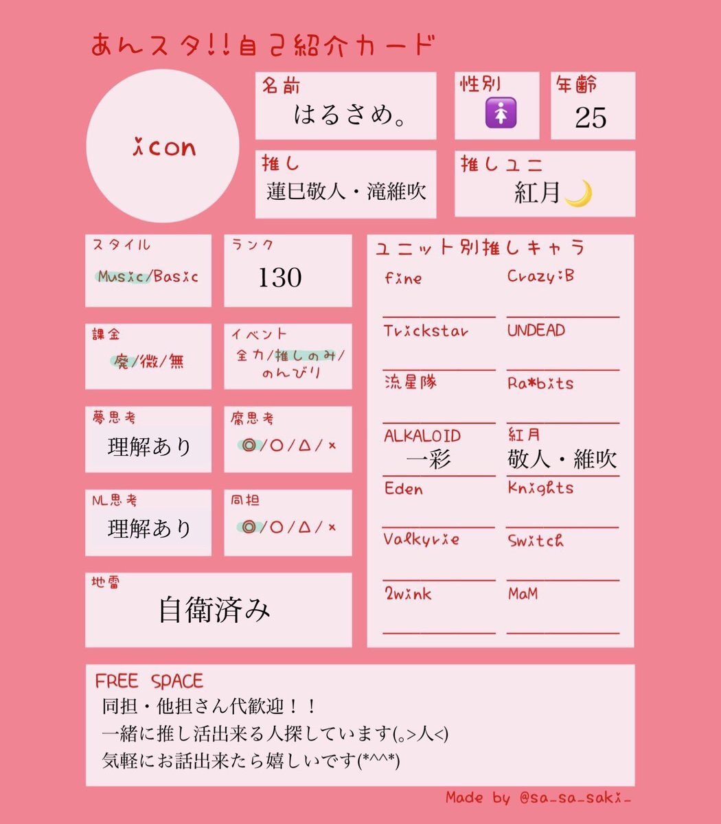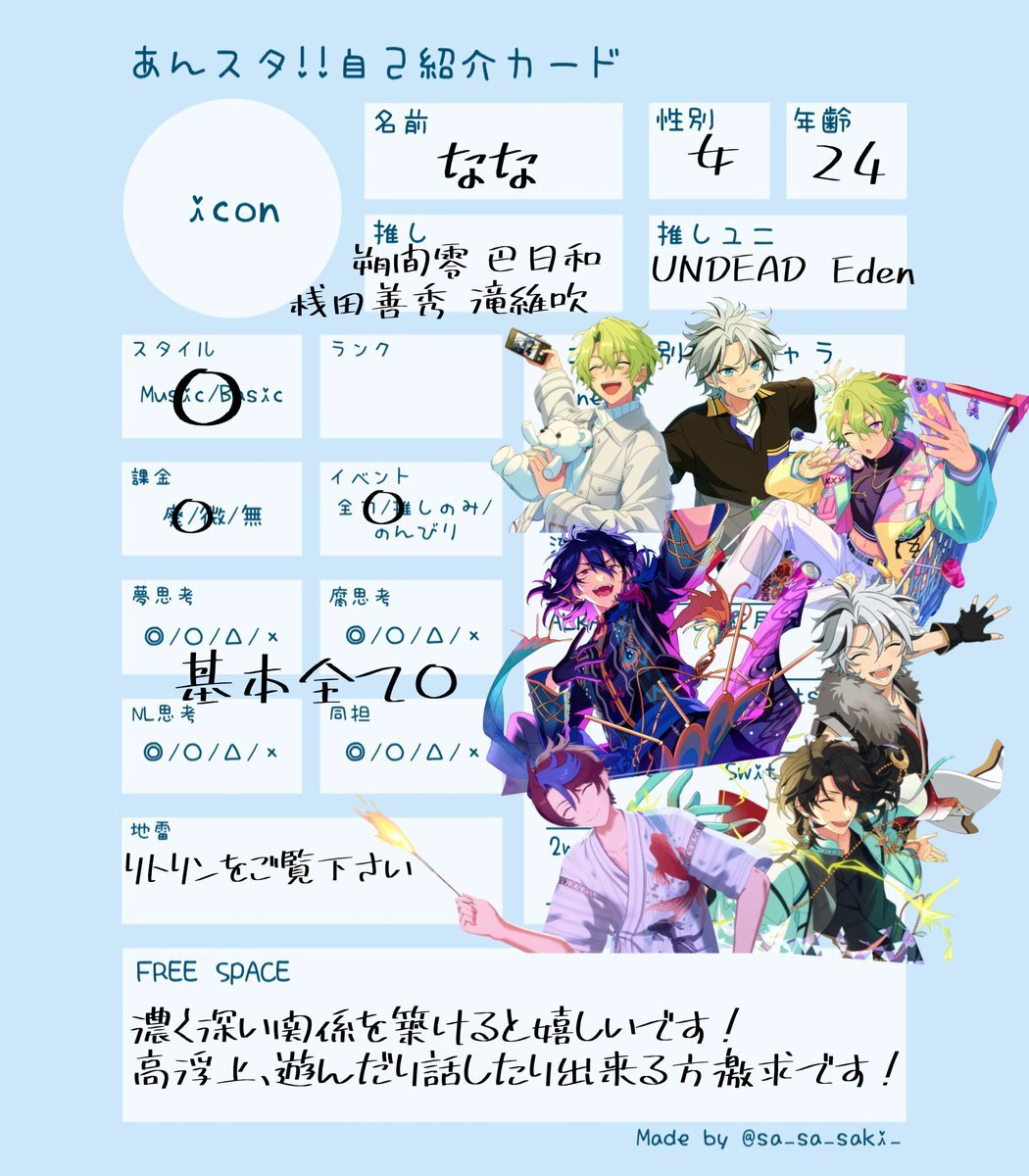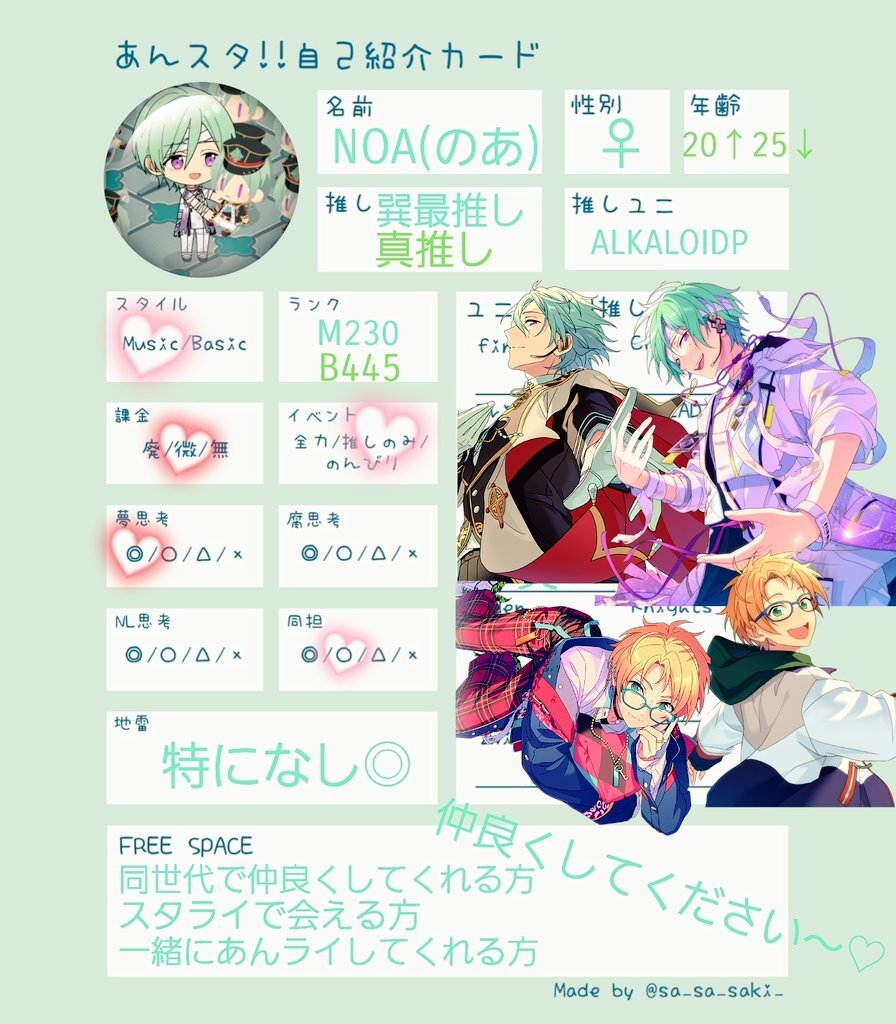 あんスタ自己紹介カード 初めてのお友達探しです🍀* ゚ 特に同年代の方繋がっていただけるとすごく嬉しいです🤝 挨拶以降も沢山お話できると嬉しいです🥰 ♡or♻️でお迎えします! #あんスタ好きな人と繋がりたい #成人済あんスタPと繋がりたい #社会人のあんスタPと繋がりたい pic.x.com/zQTY41HGNZ