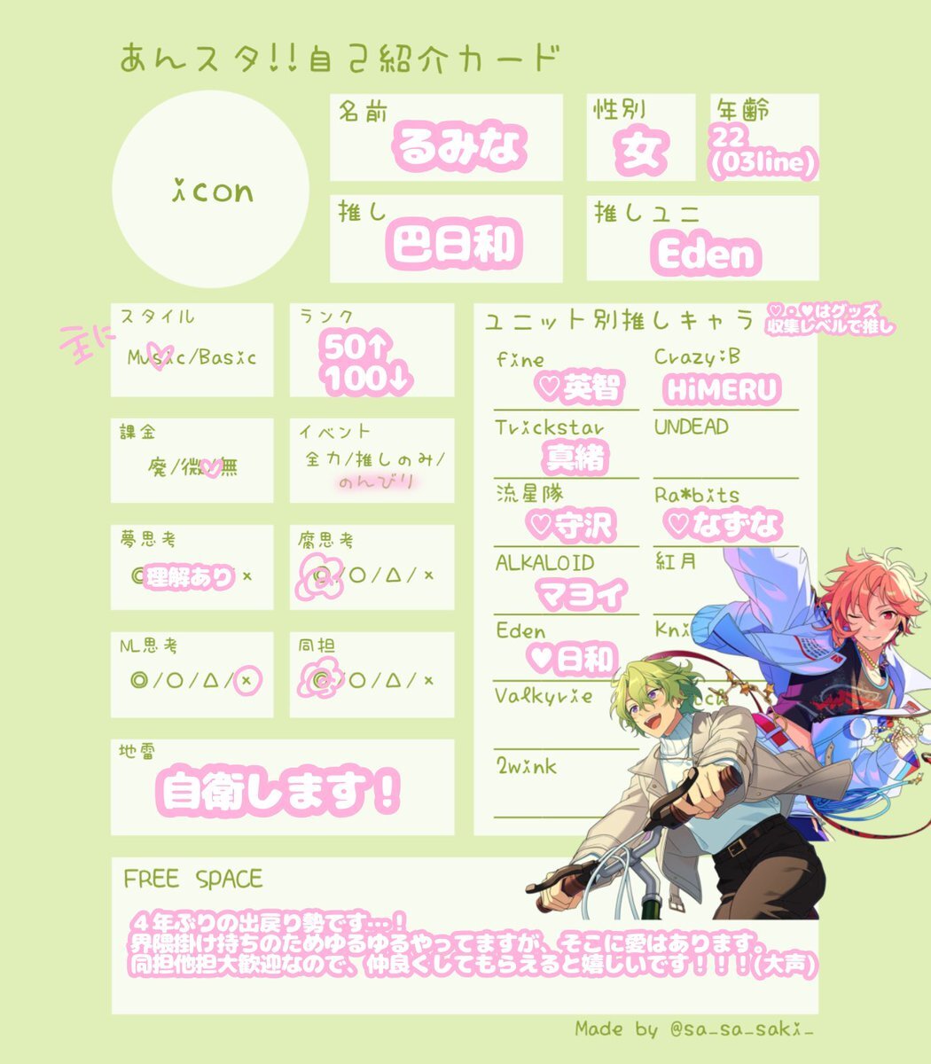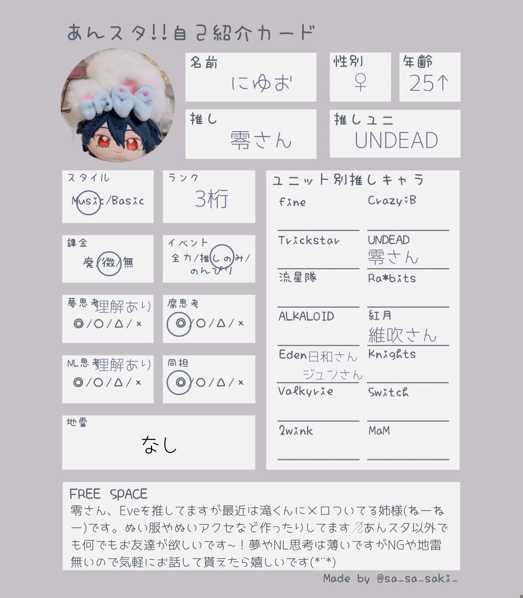 詳細と反応は元ツイへお願いしますm(*_ _)m (検索反映しないため別垢から失礼します) #あんスタ好きさんと繋がりたい #あんスタ自己紹介カード #成人済みあんスタPと繋がりたい #あんライ深夜勢さんと繋がりたい x.com/enl09tr/status…