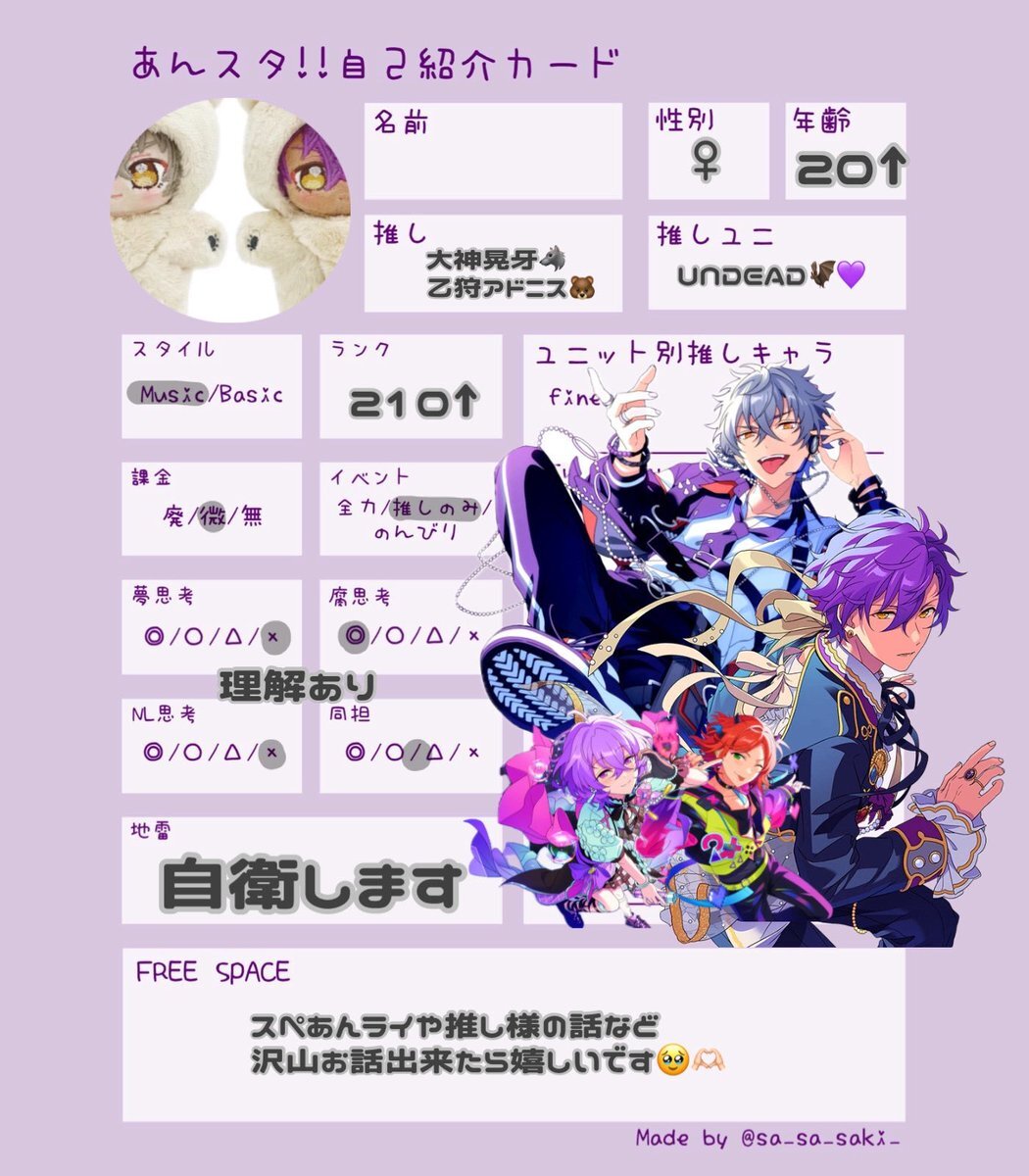 💜 お友達探してます꒰•‧̫•ू꒱🎶💓 #あんスタ自己紹介カード #あんスタ好きと繋がりたい #あんスタ好きさんと繋がりたい #成人済みあんスタPと繋がりたい x.com/sr112kr/status…