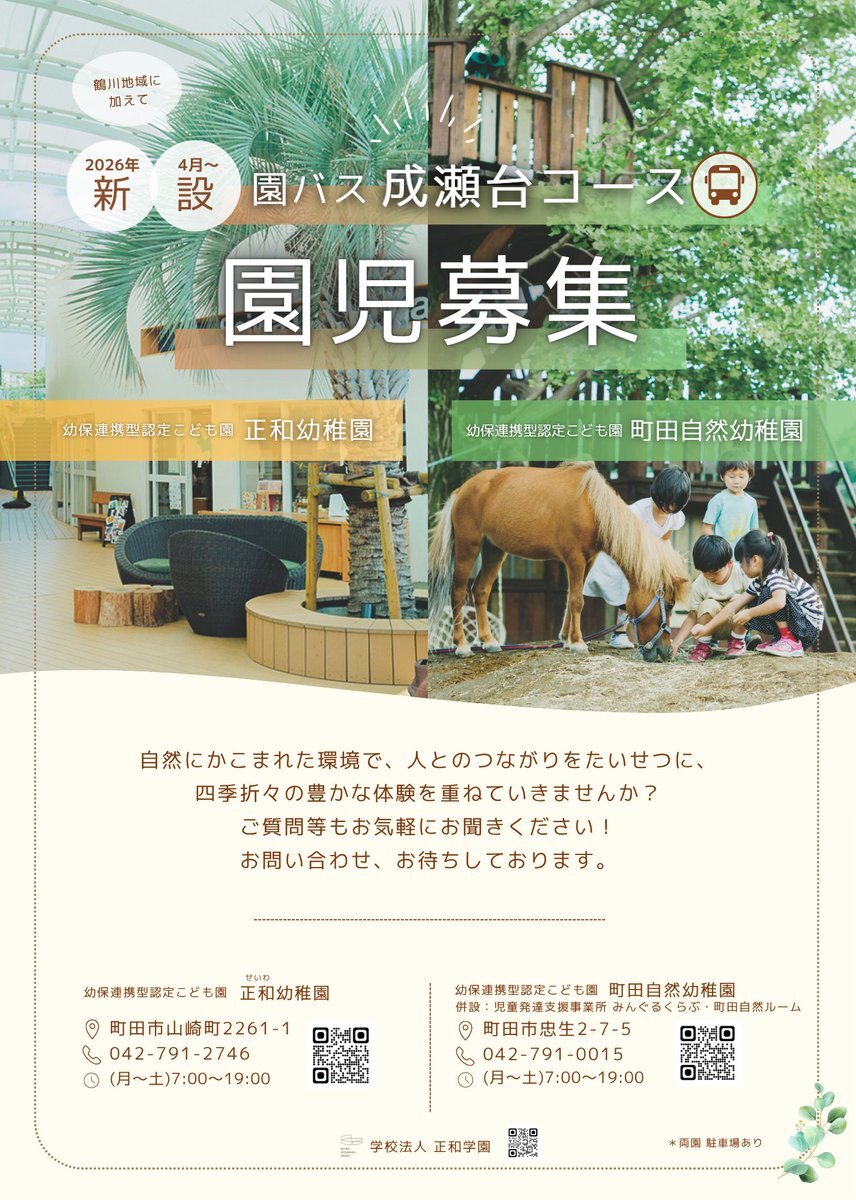 🌿2026年4月「#成瀬台 コース」新設! #正和幼稚園 #町田自然幼稚園 まで #園バス で通園可能になります✨ #自然 あふれる環境で、動物とのふれあいや森遊びを通して心と体を育みます。 園見学・質問もお気軽にどうぞ! 📞正和幼稚園 042-791-2746 📞町田自然幼稚園 042-791-0015 #入園 #園児募集 pic.x.com/BzMiAADfeW