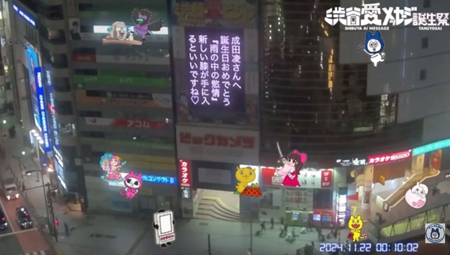 #2024年11月22日… 10番目 の愛メッセージ として、放映されていますっ #成田凌 さん、今年2025年も、その誕生日お祝いしませんか!? 今から放映予約できるよ〜 成田凌さんへ 誕生日おめでとう 『雨の中の慾情』 新しい膝が手に入 るといいですね♡ #渋谷愛ビジョン で推し活🧡 本人に届け! pic.x.com/888Q02dbWM