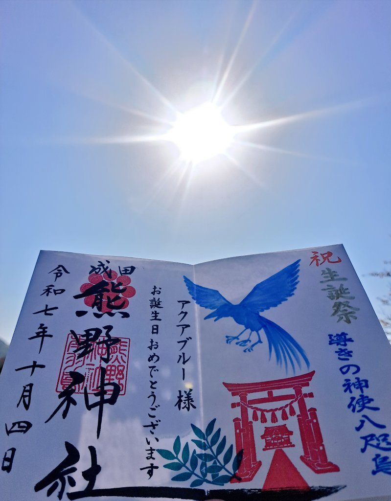 成田豊住熊野神社⛩️ 誕生日詣➅ 青い導きの神使八咫烏デザインの誕生日御朱印を頂きました⛩️✨ 八咫烏の誕生日御朱印めっちゃ嬉しいです😆⤴️⤴️しかも青色💙 今年も千葉県で誕生日詣巡り楽しめましたことに感謝です✨😌✨ 成田なので空には大きな飛行機✈️ #御朱印巡り #成田豊住熊野神社 pic.x.com/hepnMGEpcg