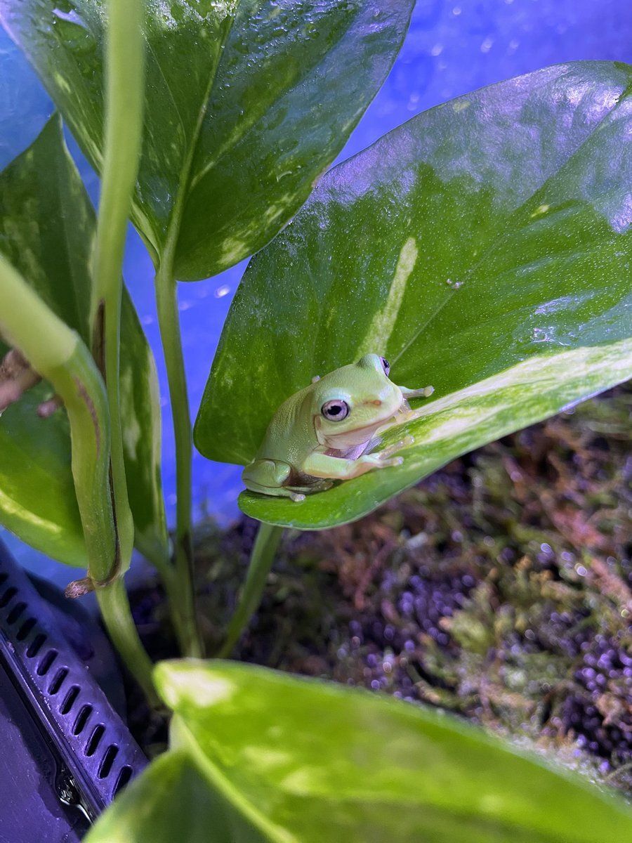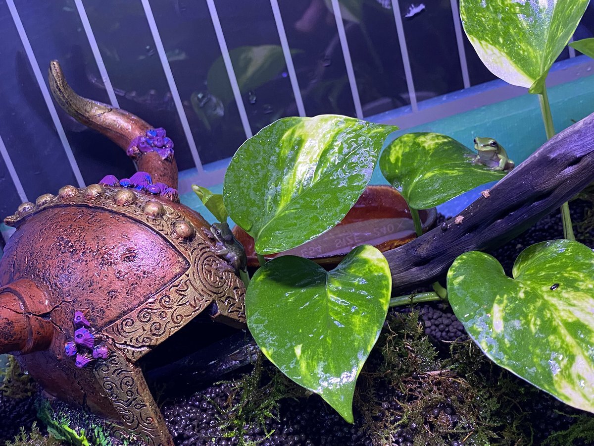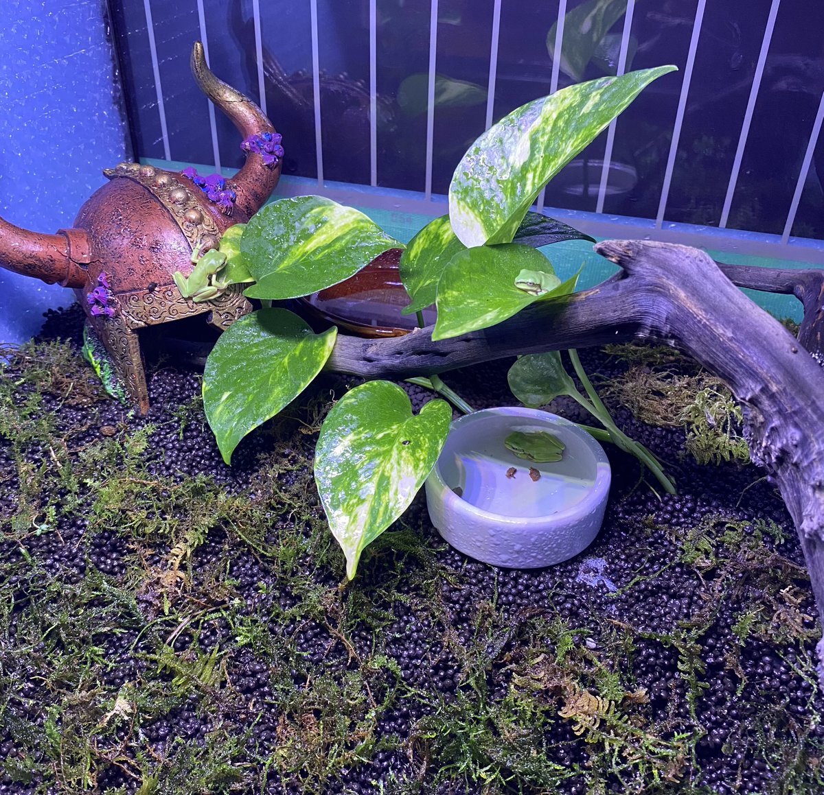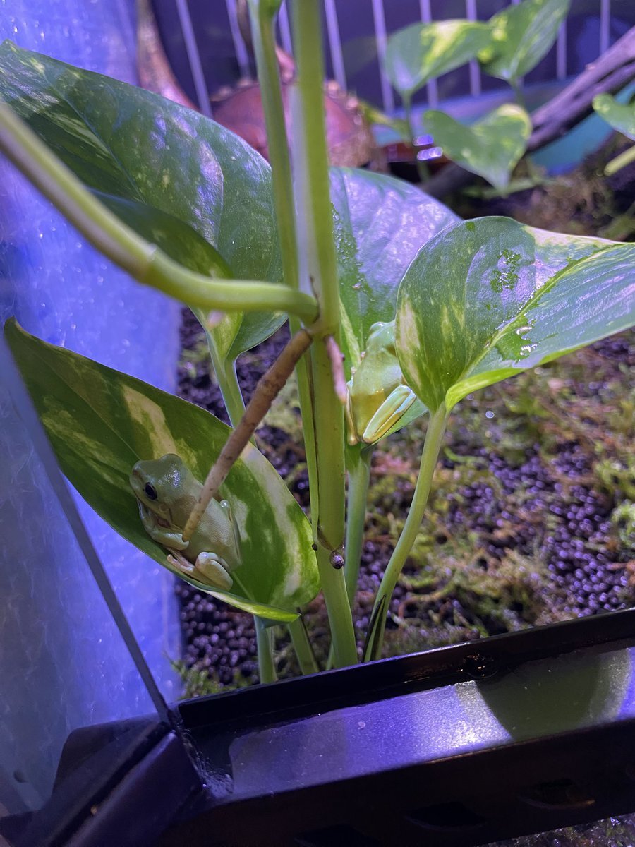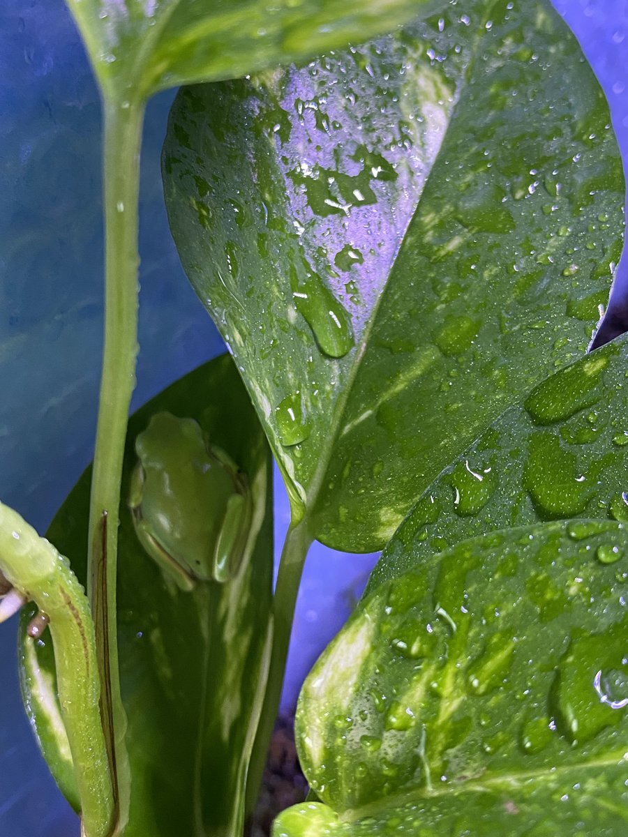 自然界にいたら絶対ポトスに見えるよ、ポルくん頑張ってるね🐸🐸 #イエアメカエル #成長の記録 #擬態 #ポトス pic.x.com/hqTSmixure