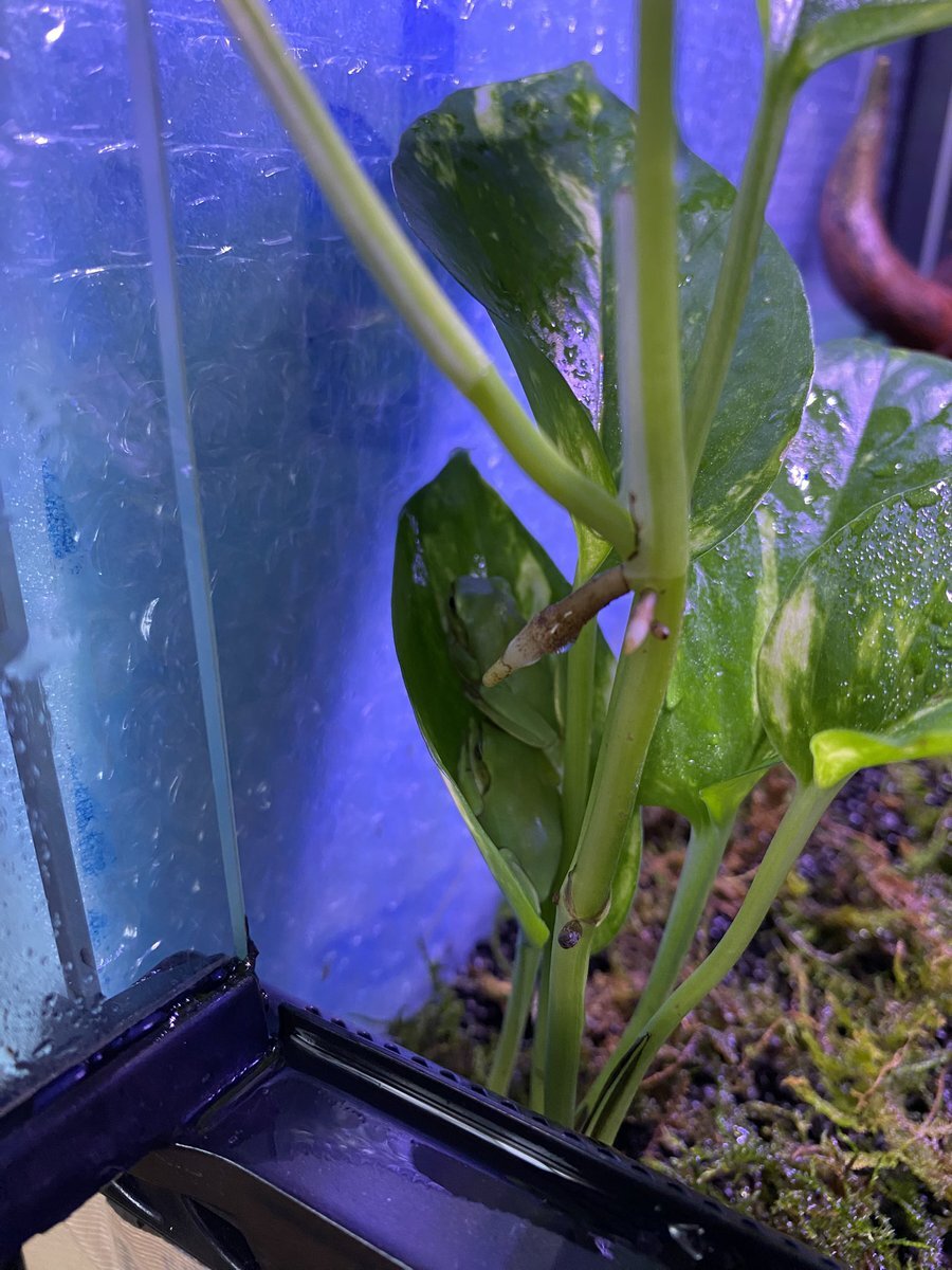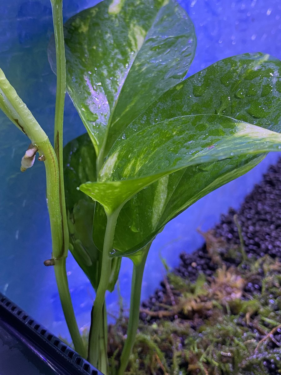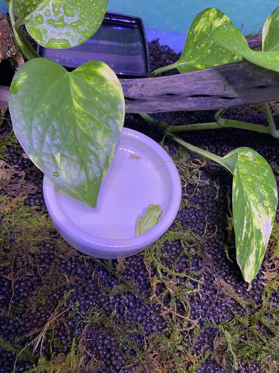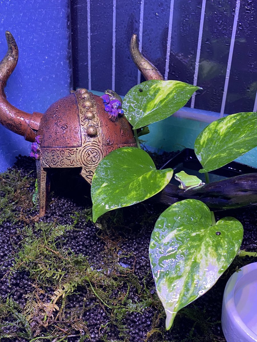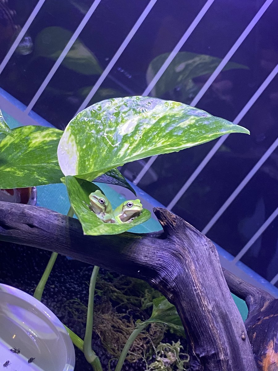 自然界にいたら絶対ポトスに見えるよ、ポルくん頑張ってるね🐸🐸 #イエアメカエル #成長の記録 #擬態 #ポトス pic.x.com/hqTSmixure