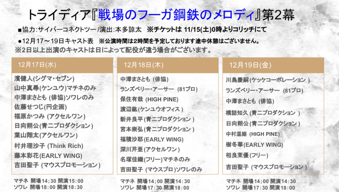 お知らせ!! #戦場のフーガ 鋼鉄のメロディ第2幕 スケジュールでました! 自分は、17日公演です!!劇場でまってるねぇえ!!!! x.com/tridia_roudoku…