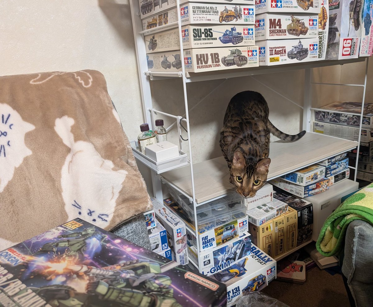 リビングのプラモコーナーを整理。 戦車模型を主体にしたかったみたい😅 ですが早くもテンに攻撃されそうな嫌な予感しかしないよ!🤣 #プラモ好きと繋がりたい #戦車模型 #猫好きさんと繋がりたい #ベンガル猫 #ベンガル pic.x.com/rqgjQouKhP