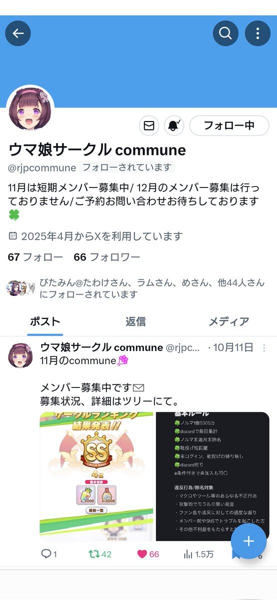 ウマ娘サークルcommuneの最新情報はとにかくヘッダーをチェックしよう!! しれっとここの文章が変わります。 どうやら11月のみの短期のメンバーに関しては実はまだ募集中のようですね。 まあこの時期に短期加入できる方が残ってるのかは分かりませんが…(¯―¯٥)。 #戯言 pic.x.com/MYG4rb0Dvr