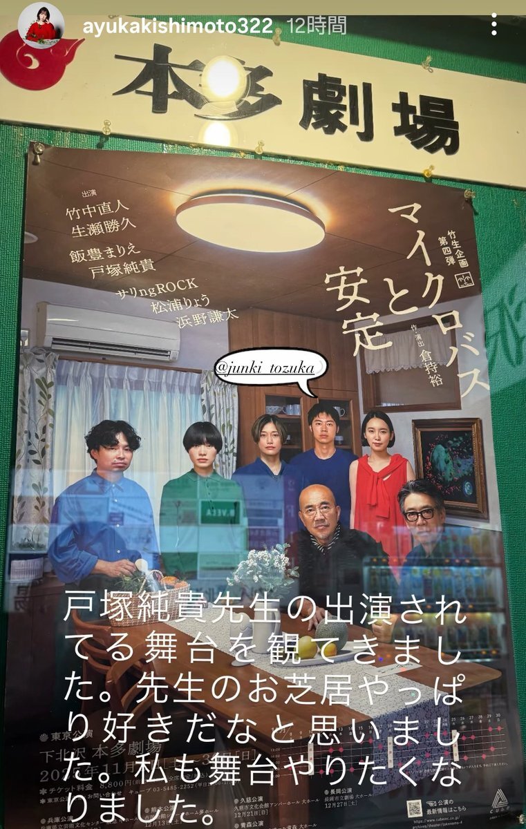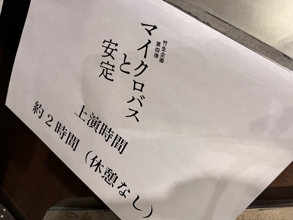 #竹生企画 第四弾『#マイクロバスと安定』】 明日11/30(日)は千秋楽🎉13:00開演です! 上演時間:約2時間(途中休憩なし) 当日券は開演1時間前より劇場前受付にて販売(現金のみ)、若干枚数のご用意です。 #竹中直人 #生瀬勝久 #飯豊まりえ #戸塚純貴 #サリngROCK #松浦りょう #浜野謙太