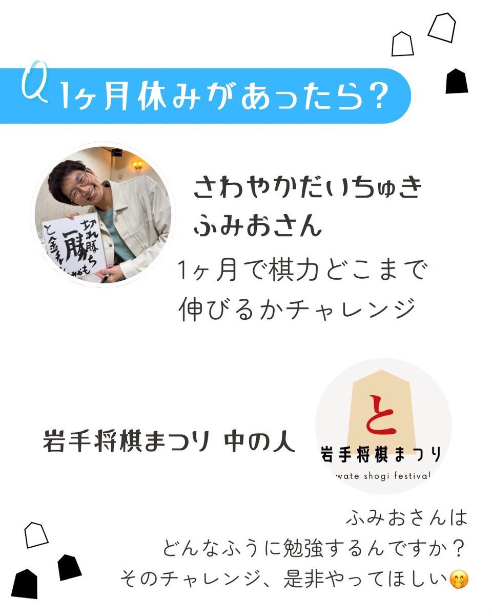 ゲストの先生方にお答えいただく 一問一答🐯 今回のクエスチョンは 「1ヵ月休みがあったら?😸」 本日は... さわやかだいちゅき ふみおさんです🍔 岩手将棋まつりまで あと34日✨ #戸辺誠七段 #山本博志五段 #小山怜央四段 #さわやかだいちゅきふみおさん #将棋 pic.x.com/DPUUzhbLtV