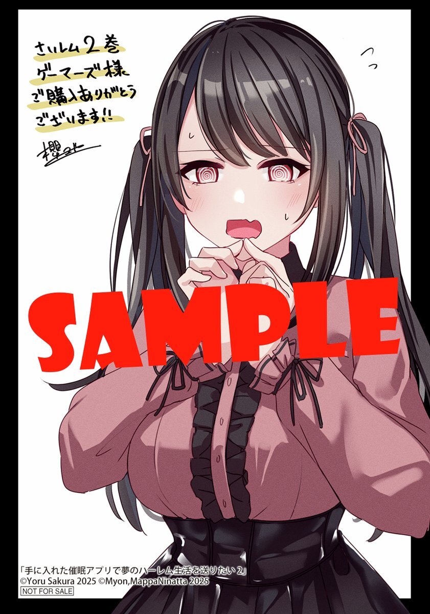 / 明日発売 新刊特典情報‼️ \ 『#手に入れた催眠アプリで夢のハーレム生活を送りたい 2』(1/2) ✨✨有償特典✨✨ 1枚目:B2タペストリー(メロンブックス) 2枚目:B2タペストリー(ゲーマーズ) ✨✨店舗特典✨✨ 3枚目:イラストカード(メロンブックス) 4枚目:ブロマイド(ゲーマーズ) pic.x.com/qcFkIadDxf
