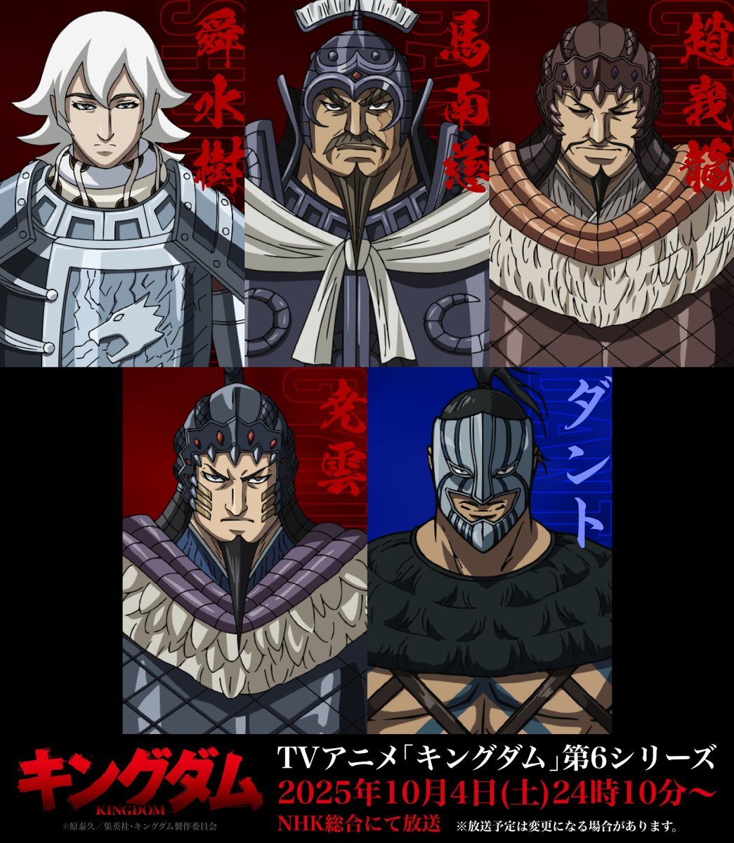 // 📢TVアニメ「#キングダム」 新規追加キャラクター解禁 \\ 📌舜水樹役:#坂泰斗 📌趙峩龍役:#東地宏樹 📌馬南慈役:#手塚秀彰 📌尭雲役:#真野恭輔 📌ダント役:#藤沼建人 📅2025年10月4日(土)24:10~NHK総合放送予定 詳細は👇 kingdom-anime.com/news/detail.ph… pic.x.com/efUAOoTPRE