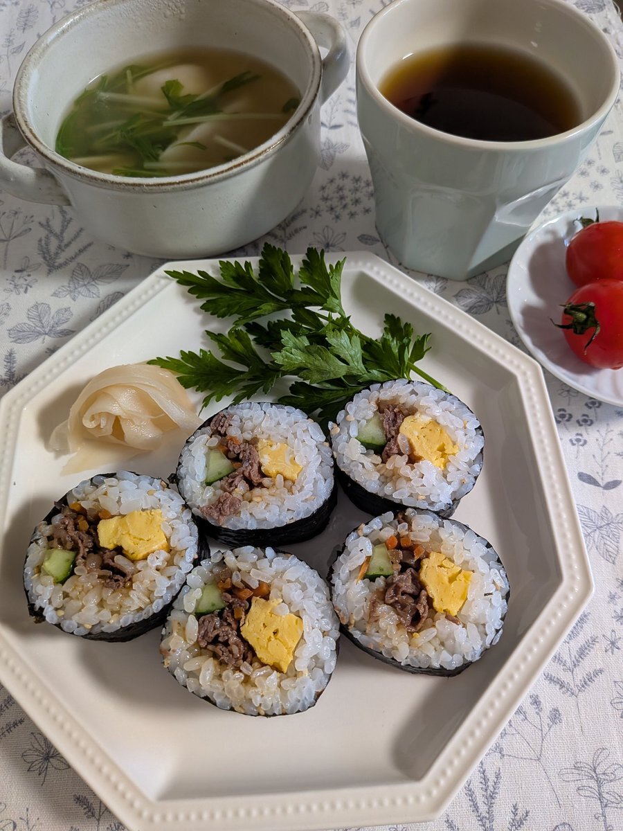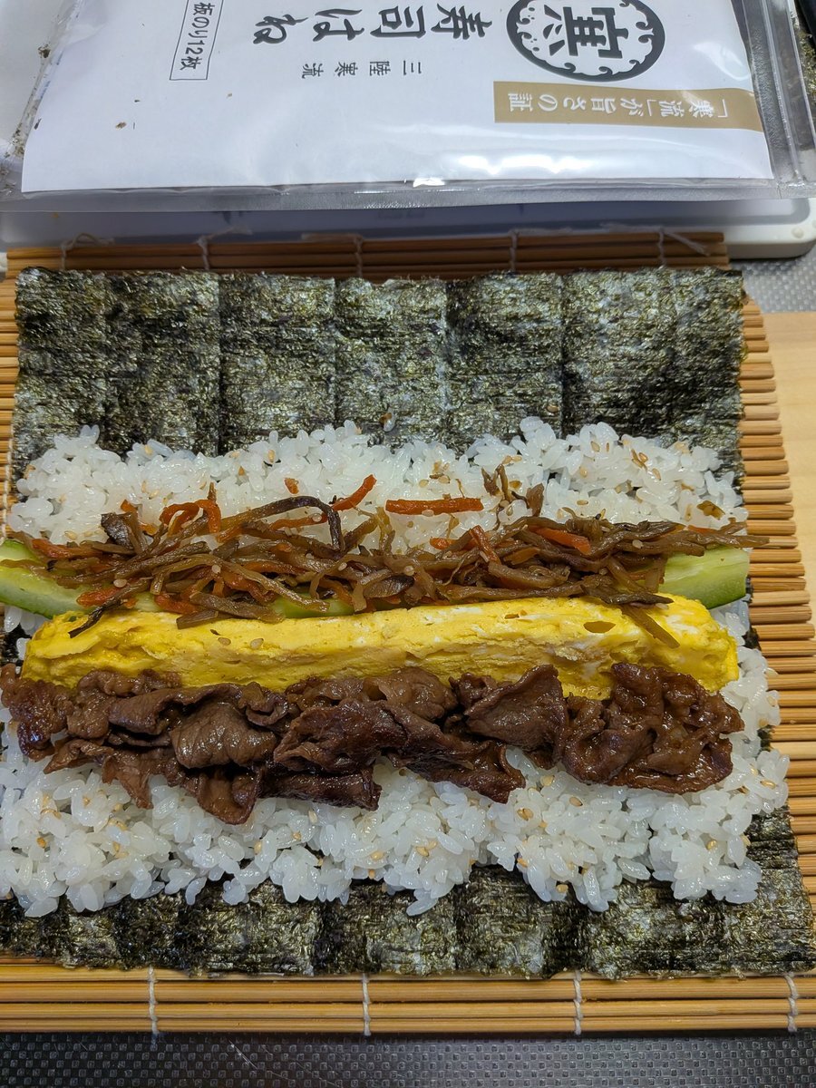 えいしゅう博士のリベンジ❗ 「魂の #手巻き寿司」作ってみましたぁ〜🍅 「カンタン酢」も日の目を見ました😁ニッ アツアツ🍚にゴマとカンタン酢を加えてすし飯に👍 卵焼き&🥒&牛肉&ファミマきんぴらをon⤴️ Pointは🧄を➕️する事✎ 美味しく出来ちゃいました〜✨ ガリは手作り🤍 #おうちごはん pic.x.com/N9j1mAuRyt
