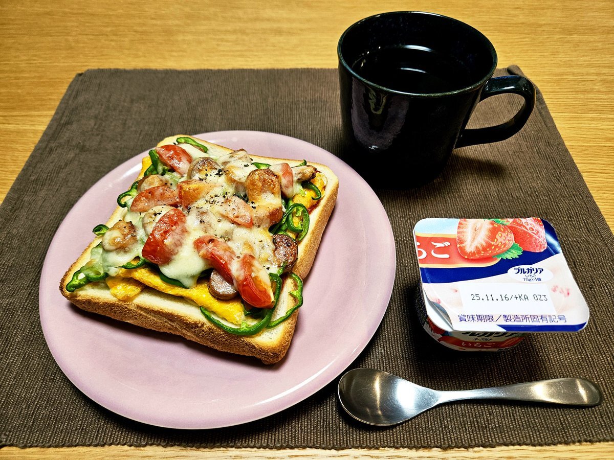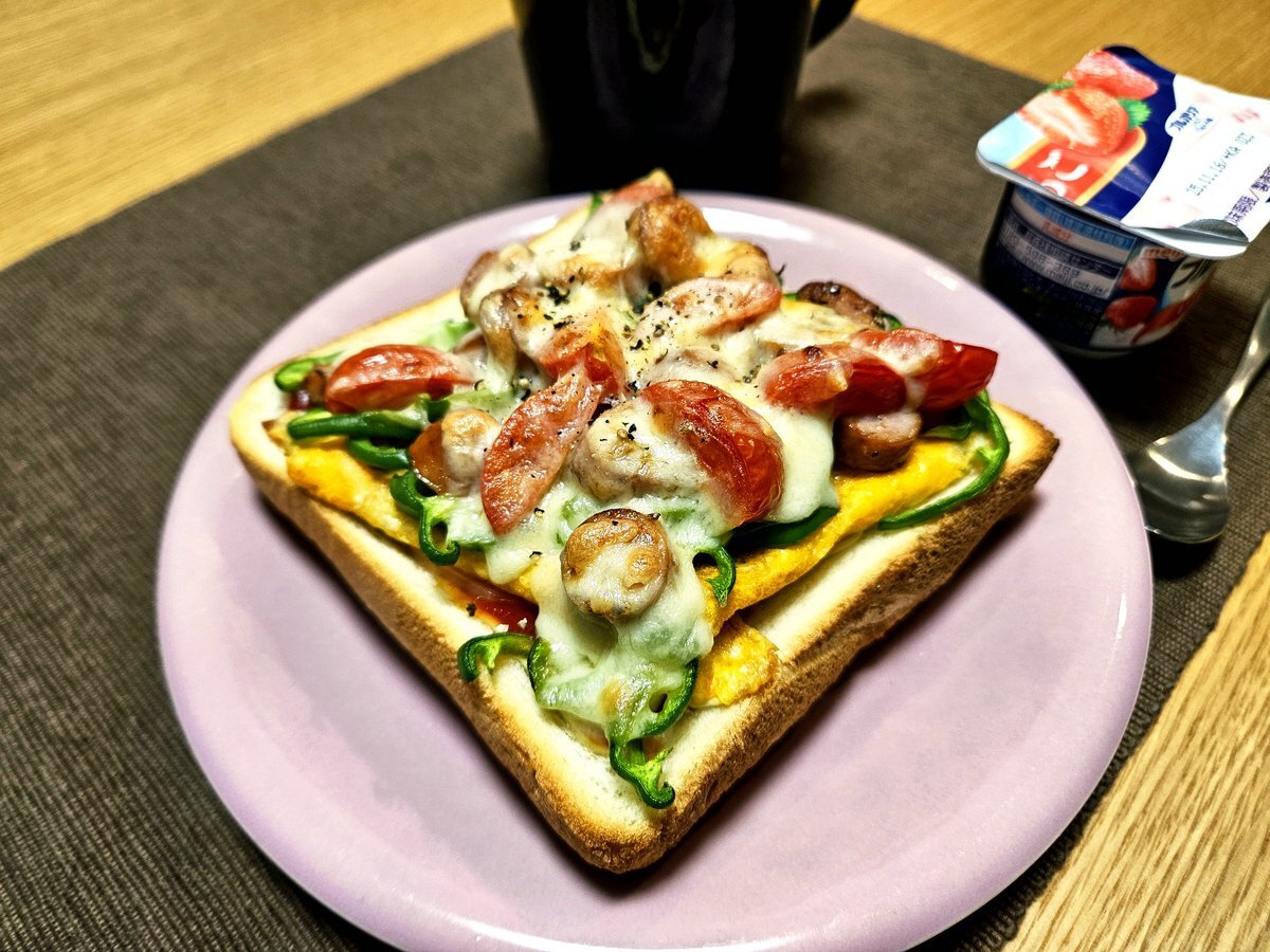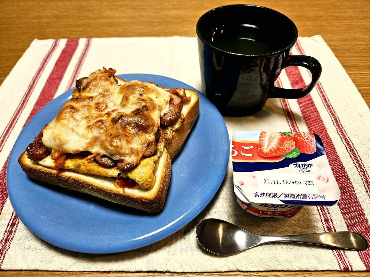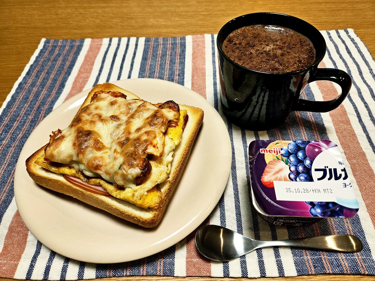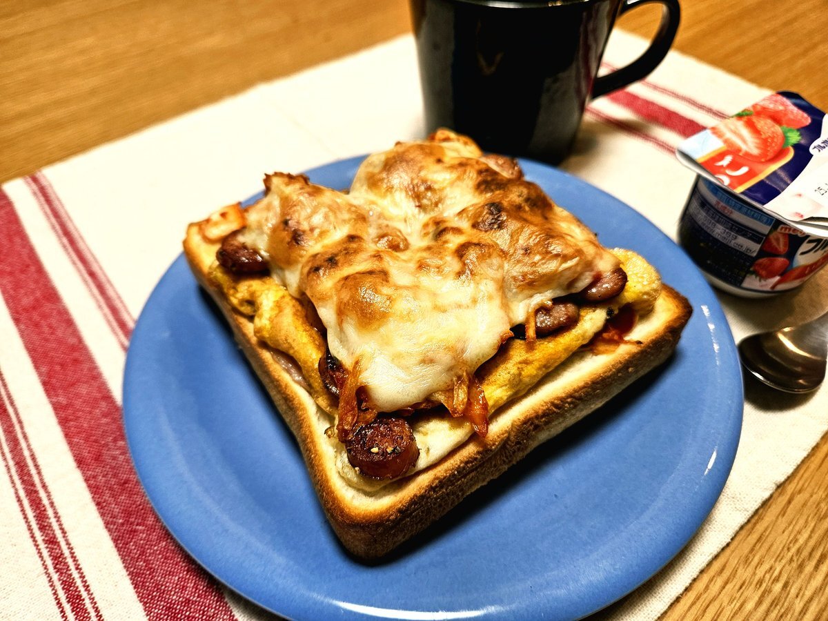 映えないであろう今日の仕事終わりの独り暮らしお夜食🍚 『キムチとソーセージのピリ辛チーズ玉子トーストとホットミルクココアセット』 いただきます。 #料理 #手料理日記 #男飯 pic.x.com/kKikjZymsT
