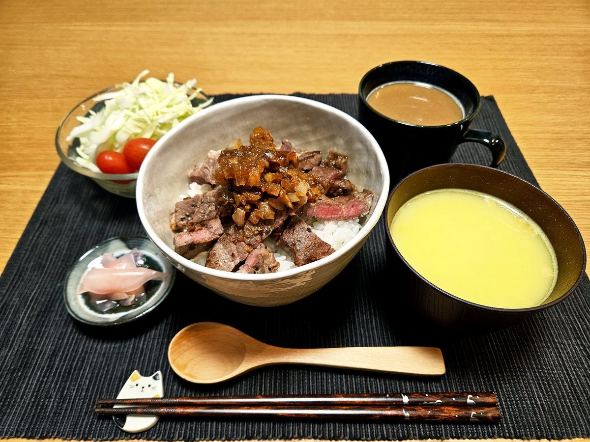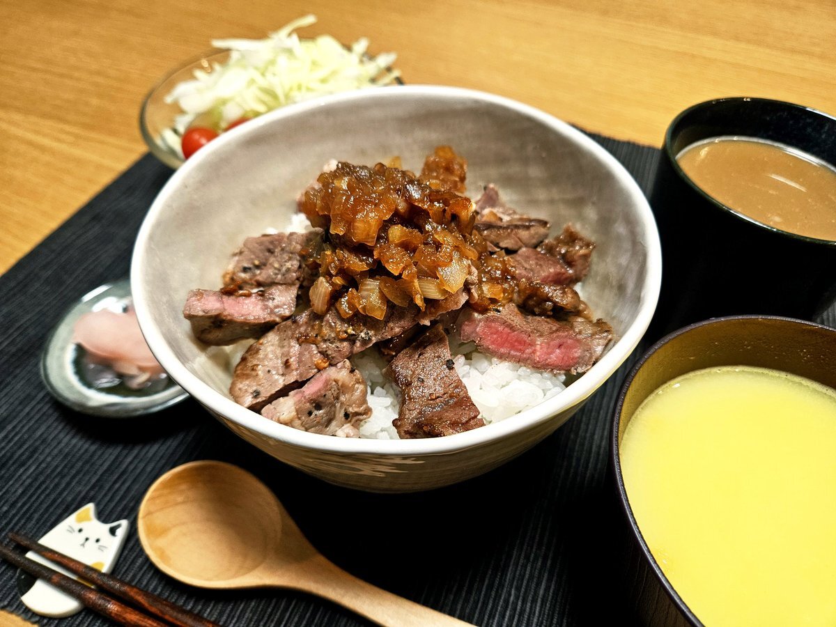 映えないであろう今日の独り暮らし飯🍚 『ステーキ丼セット』 ステーキ丼 コーンポタージュ 生姜の甘酢漬け いただきます。 #手料理 #手料理日記 #男飯 pic.x.com/uR7nTRFt5B