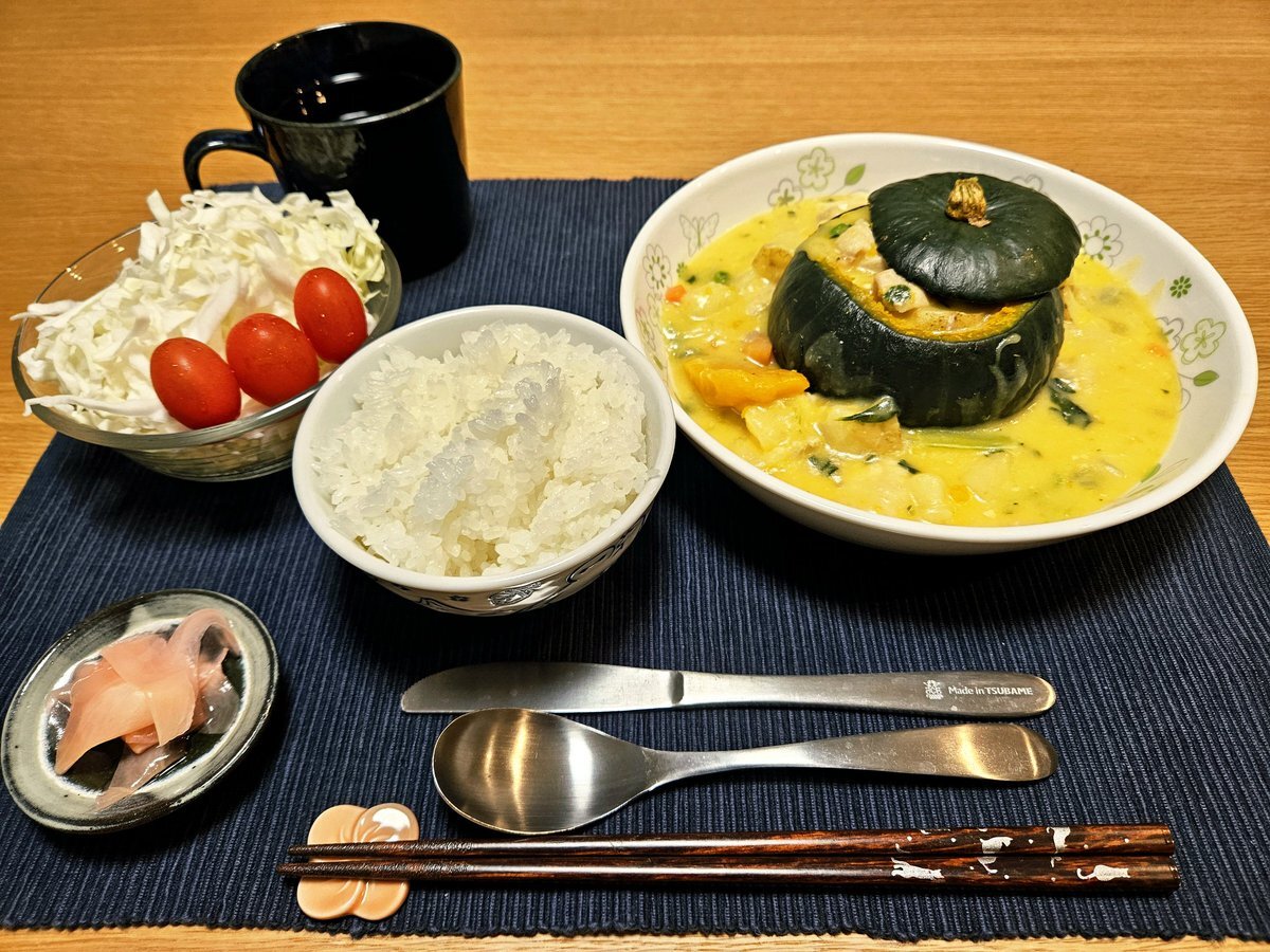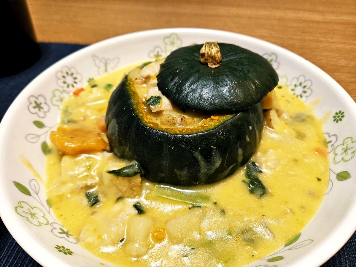映えないであろう今日の独り暮らし飯🍚 『全部食べられるかぼちゃのハロウィン🎃クリームシチューセット』 正解は、クリームシチューでした😁 少し早いですがハロウィン🎃風にしてみました😆 いただきます。 #手料理 #手料理日記 #男飯 #クリームシチュー pic.x.com/J6EoGkNu8V