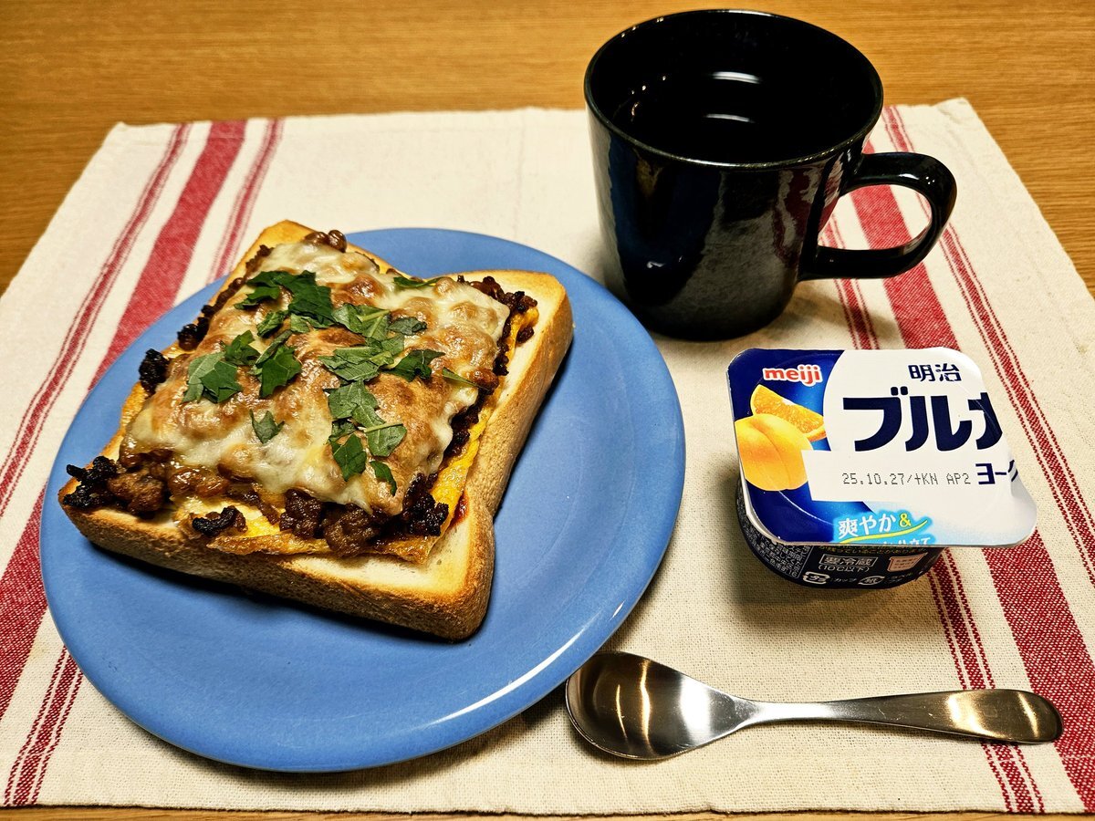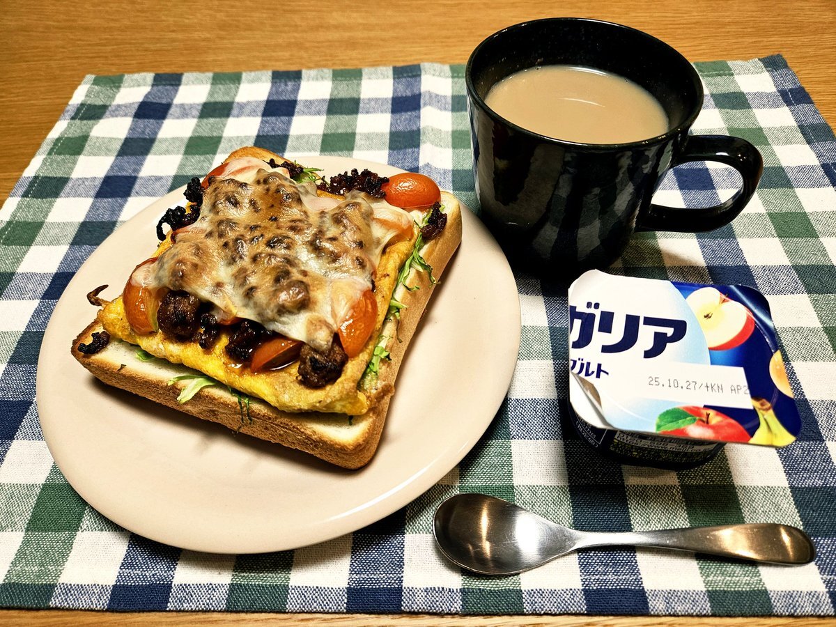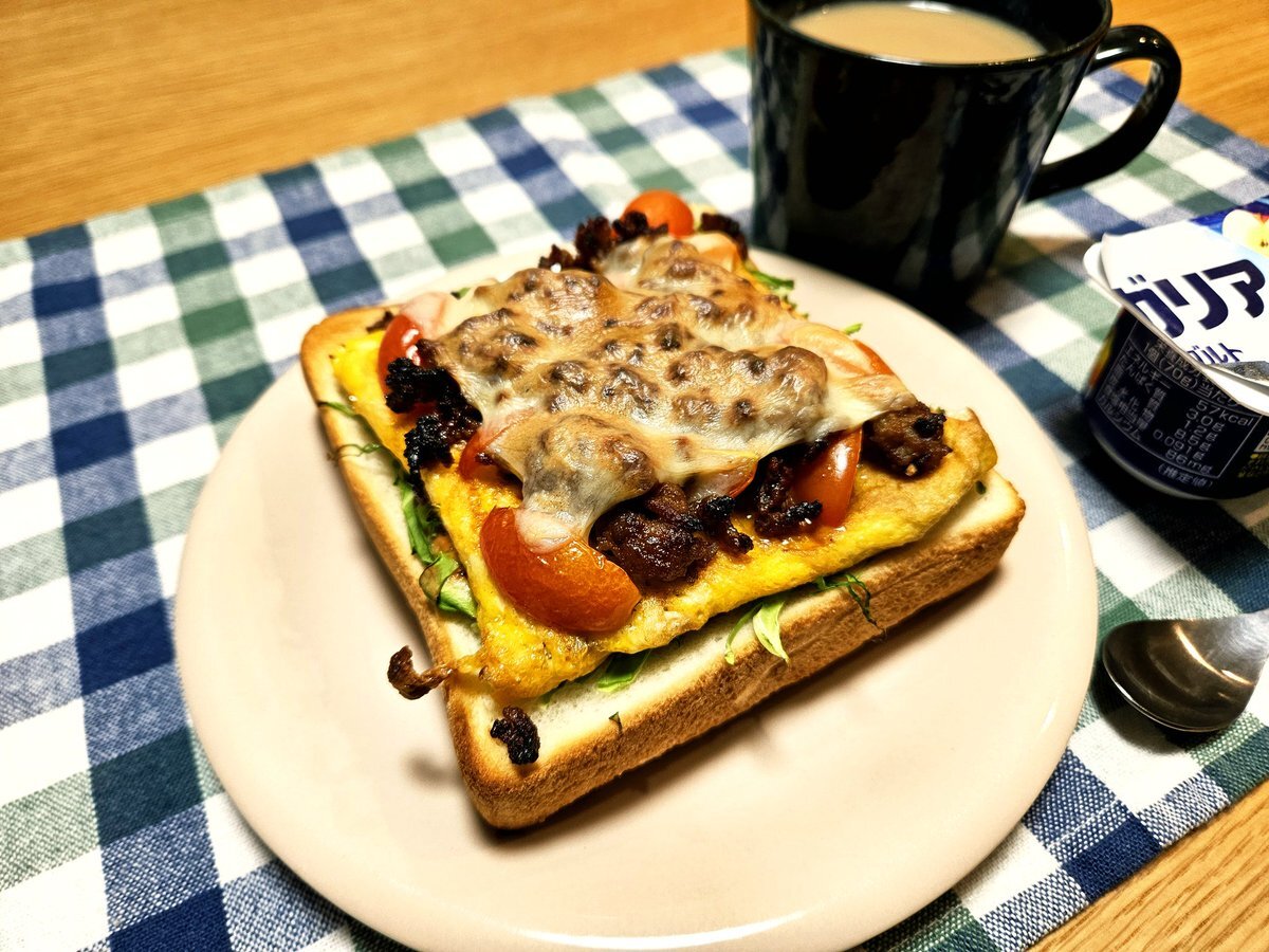 映えないであろう今日の仕事終わりの独り暮らしお夜食🍚 『ひき肉とトマト🍅のチーズ玉子トースト(特製ソースがけ)とホットマサラチャイセット』 いただきます。 #手料理 #手料理日記 #男飯 pic.x.com/0aB4xhQYaP