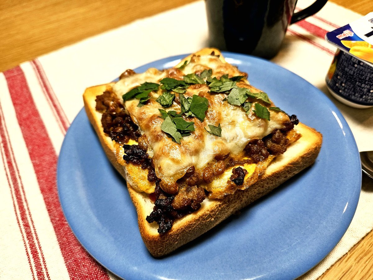 映えないであろう今日の仕事終わりの独り暮らしお夜食🍚 『大葉香る 納豆とひき肉のチーズ玉子トーストと紅茶(ダージリン)セット』 いただきます。 #手料理 #手料理日記 #男飯 pic.x.com/e1PiZoh4sF