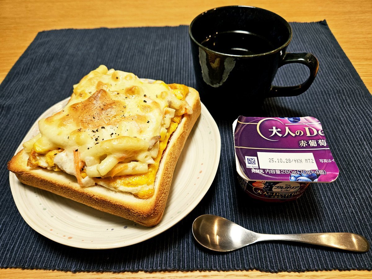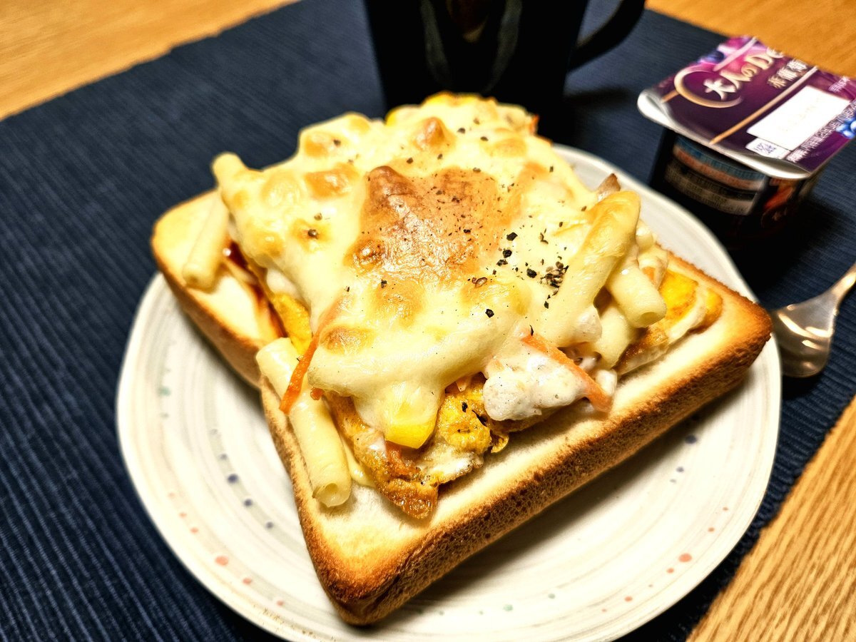 映えないであろう今日の仕事終わりの独り暮らしお夜食🍚 『黒胡椒香る マカロニグラタンチーズ玉子パンと紅茶(セイロン)セット』 いただきます。 #料理 #手料理日記 #男飯 pic.x.com/is4n8REY7I