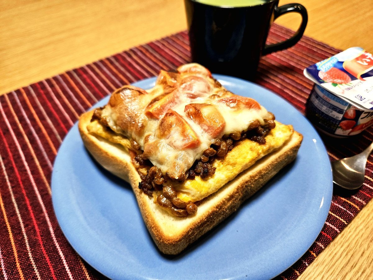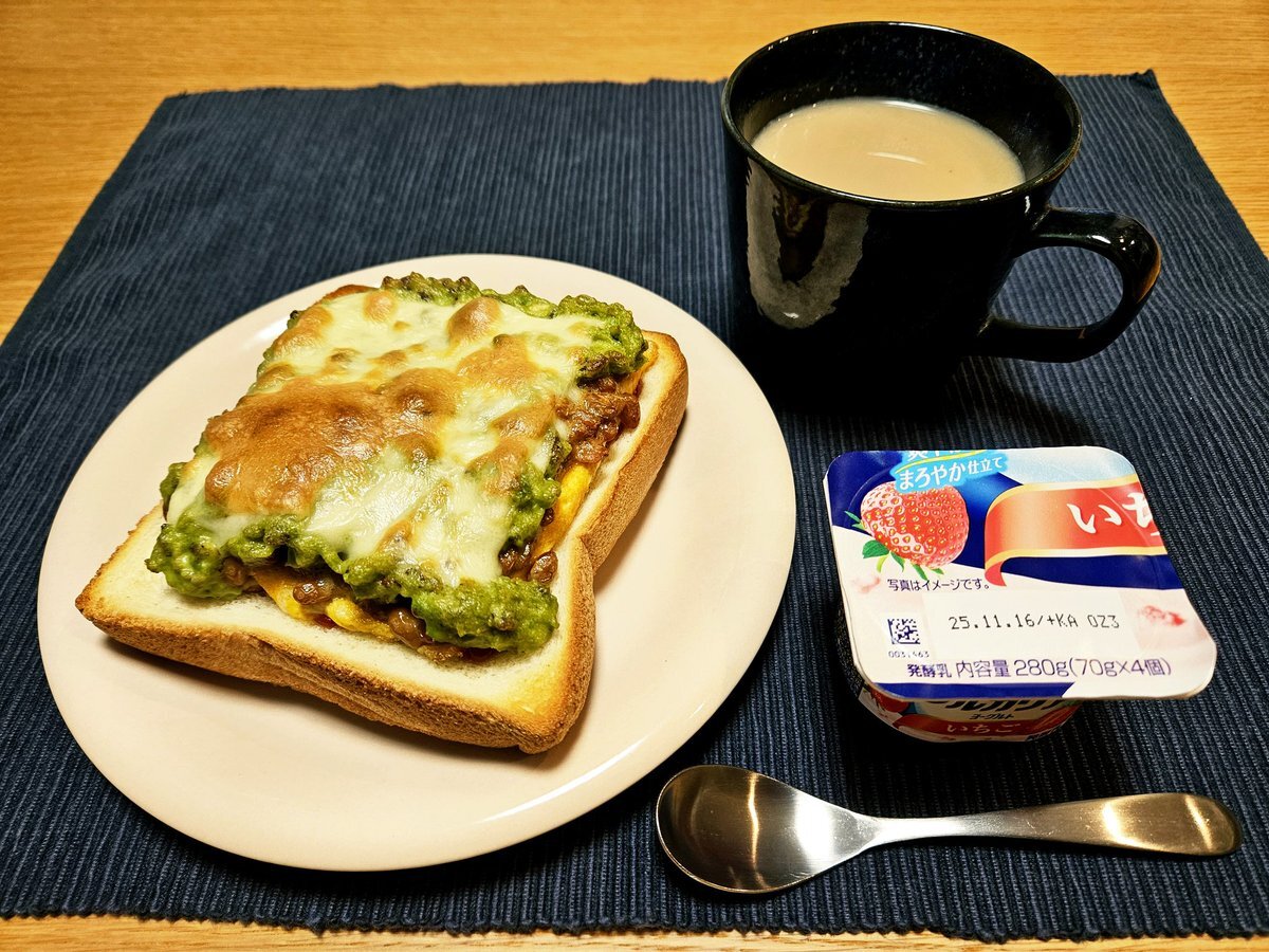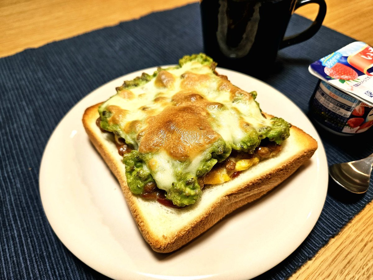 映えないであろう今日の仕事終わりの独り暮らしお夜食🍚 『納豆とアボカド🥑ペーストのチーズ玉子トーストとマサラチャイセット』 いただきます。 #手料理 #手料理日記 #男飯 pic.x.com/bAU6aJPvQ4